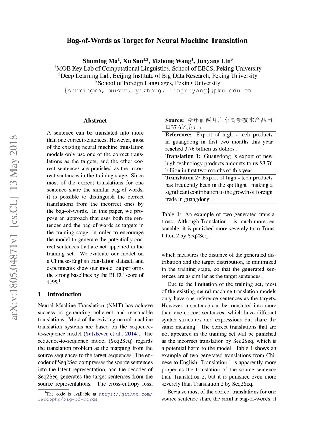 A sentence can be translated into more than one correct sentences. However, most of the existing neural machine translation models only use one of the correct translations as the targets, and the other correct sentences are punished as the incorrect sentences in the training stage. Since most of the correct translations for one sentence share the similar bag-of-words, it is possible to distinguish the correct translations from the incorrect ones by the bag-of-words. In this paper, we propose an approach that uses both the sentences and the bag-of-words as targets in the training stage, in order to encourage the model to generate the potentially correct sentences that are not appeared in the training set. We evaluate our model on a Chinese-English translation dataset, and experiments show our model outperforms the strong baselines by the BLEU score of 4.55.