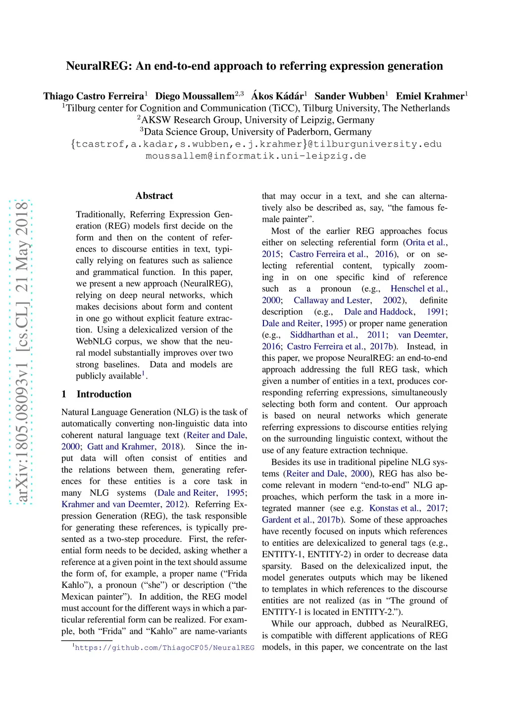 Traditionally, Referring Expression Generation (REG) models first decide on the form and then on the content of references to discourse entities in text, typically relying on features such as salience and grammatical function. In this paper, we present a new approach (NeuralREG), relying on deep neural networks, which makes decisions about form and content in one go without explicit feature extraction. Using a delexicalized version of the WebNLG corpus, we show that the neural model substantially improves over two strong baselines. Data and models are publicly available.