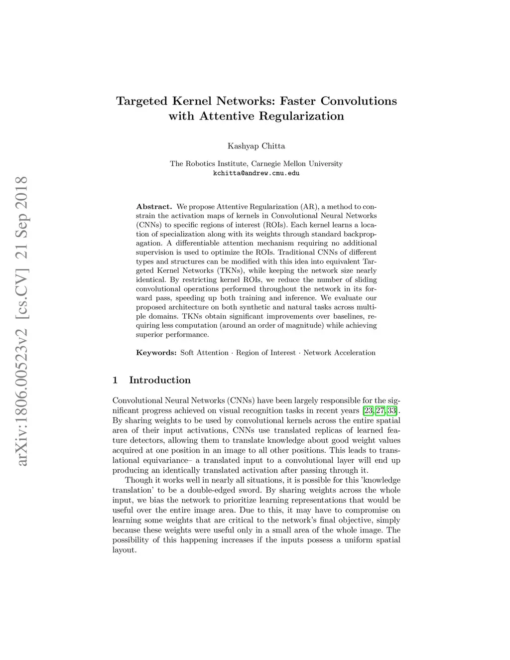 We propose Attentive Regularization (AR), a method to constrain the activation maps of kernels in Convolutional Neural Networks (CNNs) to specific regions of interest (ROIs). Each kernel learns a location of specialization along with its weights through standard backpropagation. A differentiable attention mechanism requiring no additional supervision is used to optimize the ROIs. Traditional CNNs of different types and structures can be modified with this idea into equivalent Targeted Kernel Networks (TKNs), while keeping the network size nearly identical. By restricting kernel ROIs, we reduce the number of sliding convolutional operations performed throughout the network in its forward pass, speeding up both training and inference. We evaluate our proposed architecture on both synthetic and natural tasks across multiple domains. TKNs obtain significant improvements over baselines, requiring less computation (around an order of magnitude) while achieving superior performance.