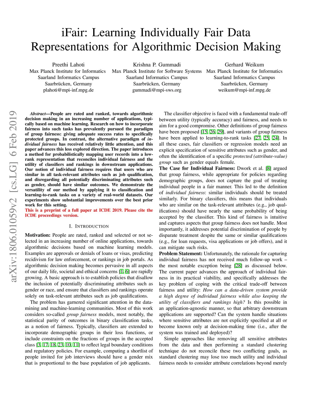 iFair: Learning Individually Fair Data Representations for Algorithmic