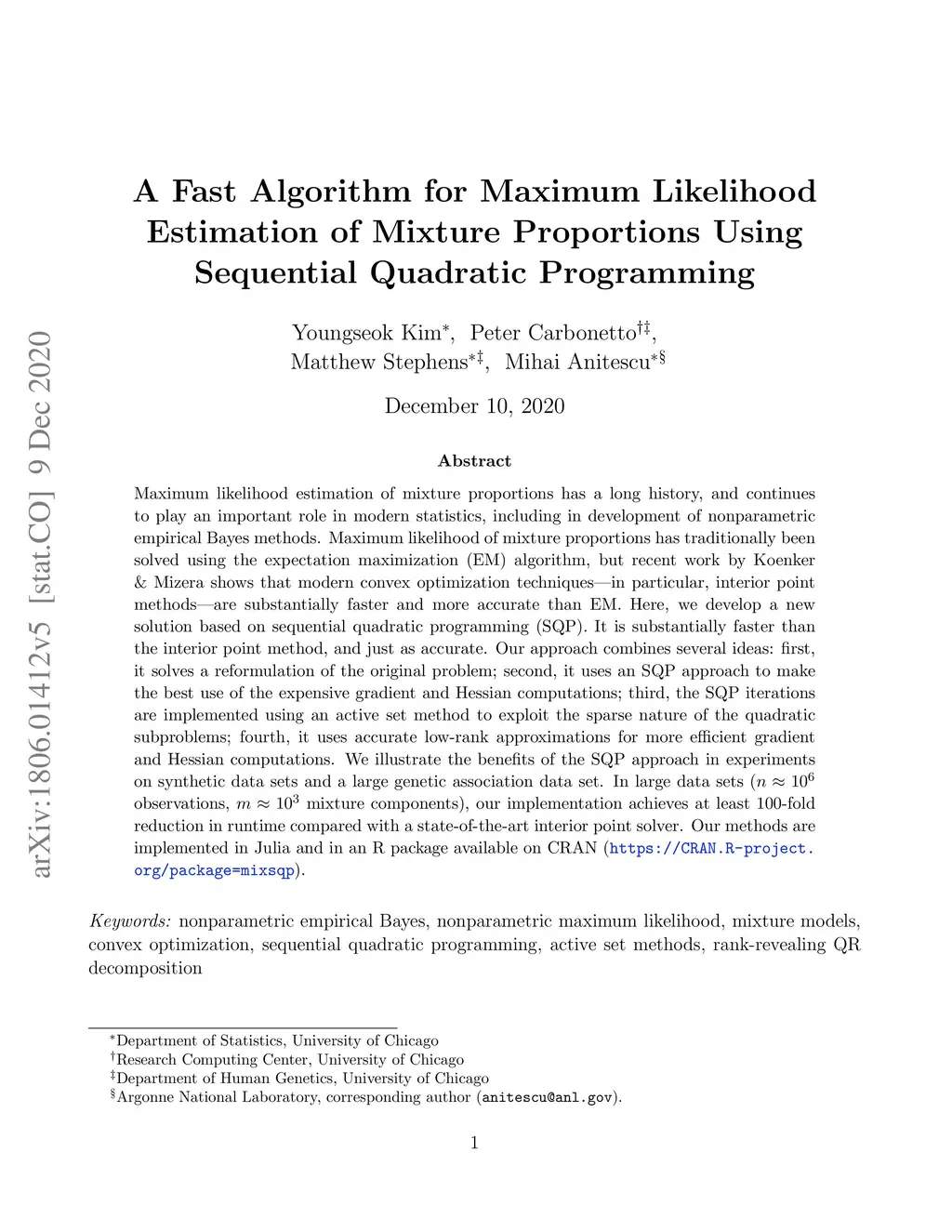Maximum likelihood estimation of mixture proportions has a long history, and continues to play an important role in modern statistics, including in development of nonparametric empirical Bayes methods. Maximum likelihood of mixture proportions has traditionally been solved using the expectation maximization (EM) algorithm, but recent work by Koenker & Mizera shows that modern convex optimization techniques -- in particular, interior point methods -- are substantially faster and more accurate than EM. Here, we develop a new solution based on sequential quadratic programming (SQP). It is substantially faster than the interior point method, and just as accurate. Our approach combines several ideas: first, it solves a reformulation of the original problem; second, it uses an SQP approach to make the best use of the expensive gradient and Hessian computations; third, the SQP iterations are implemented using an active set method to exploit the sparse nature of the quadratic subproblems; fourth, it uses accurate low-rank approximations for more efficient gradient and Hessian computations. We illustrate the benefits of our approach in experiments on synthetic data sets as well as a large genetic association data set. In large data sets (n = 1,000,000 observations, m = 1,000 mixture components), our implementation achieves at least 100-fold reduction in runtime compared with a state-of-the-art interior point solver. Our methods are implemented in Julia, and in an R package available on CRAN (see https://CRAN.R-project.org/package=mixsqp).