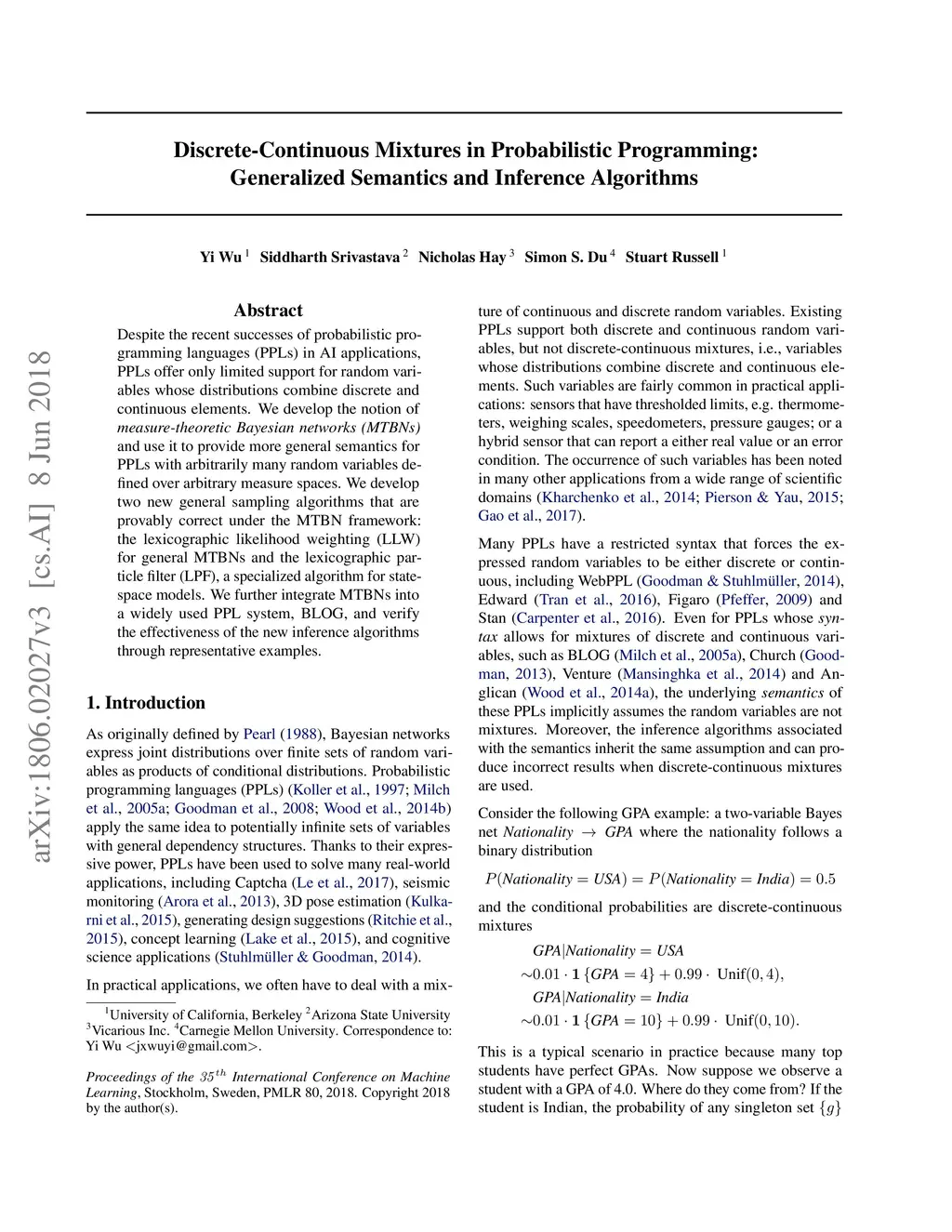 Despite the recent successes of probabilistic programming languages (PPLs) in AI applications, PPLs offer only limited support for random variables whose distributions combine discrete and continuous elements. We develop the notion of measure-theoretic Bayesian networks (MTBNs) and use it to provide more general semantics for PPLs with arbitrarily many random variables defined over arbitrary measure spaces. We develop two new general sampling algorithms that are provably correct under the MTBN framework: the lexicographic likelihood weighting (LLW) for general MTBNs and the lexicographic particle filter (LPF), a specialized algorithm for state-space models. We further integrate MTBNs into a widely used PPL system, BLOG, and verify the effectiveness of the new inference algorithms through representative examples.