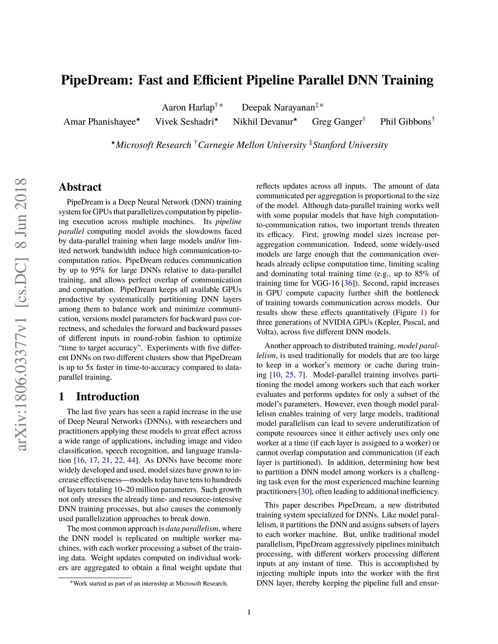 PipeDream is a Deep Neural Network(DNN) training system for GPUs that parallelizes computation by pipelining execution across multiple machines. Its pipeline parallel computing model avoids the slowdowns faced by data-parallel training when large models and/or limited network bandwidth induce high communication-to-computation ratios. PipeDream reduces communication by up to 95% for large DNNs relative to data-parallel training, and allows perfect overlap of communication and computation. PipeDream keeps all available GPUs productive by systematically partitioning DNN layers among them to balance work and minimize communication, versions model parameters for backward pass correctness, and schedules the forward and backward passes of different inputs in round-robin fashion to optimize "time to target accuracy". Experiments with five different DNNs on two different clusters show that PipeDream is up to 5x faster in time-to-accuracy compared to data-parallel training.