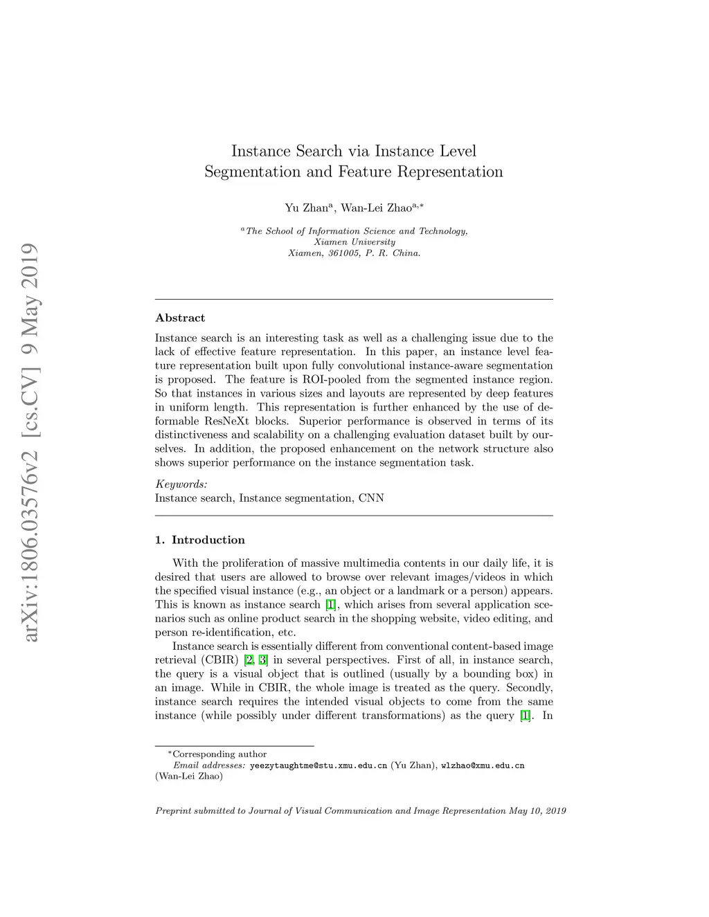 Instance search is an interesting task as well as a challenging issue due to the lack of effective feature representation. In this paper, an instance level feature representation built upon fully convolutional instance-aware segmentation is proposed. The feature is ROI-pooled from the segmented instance region. So that instances in various sizes and layouts are represented by deep features in uniform length. This representation is further enhanced by the use of deformable ResNeXt blocks. Superior performance is observed in terms of its distinctiveness and scalability on a challenging evaluation dataset built by ourselves. In addition, the proposed enhancement on the network structure also shows superior performance on the instance segmentation task.