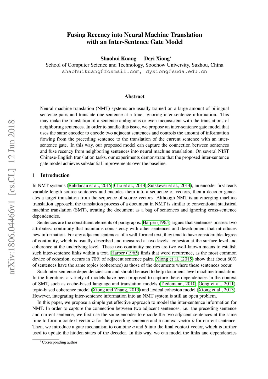 Neural machine translation (NMT) systems are usually trained on a large amount of bilingual sentence pairs and translate one sentence at a time, ignoring inter-sentence information. This may make the translation of a sentence ambiguous or even inconsistent with the translations of neighboring sentences. In order to handle this issue, we propose an inter-sentence gate model that uses the same encoder to encode two adjacent sentences and controls the amount of information flowing from the preceding sentence to the translation of the current sentence with an inter-sentence gate. In this way, our proposed model can capture the connection between sentences and fuse recency from neighboring sentences into neural machine translation. On several NIST Chinese-English translation tasks, our experiments demonstrate that the proposed inter-sentence gate model achieves substantial improvements over the baseline.