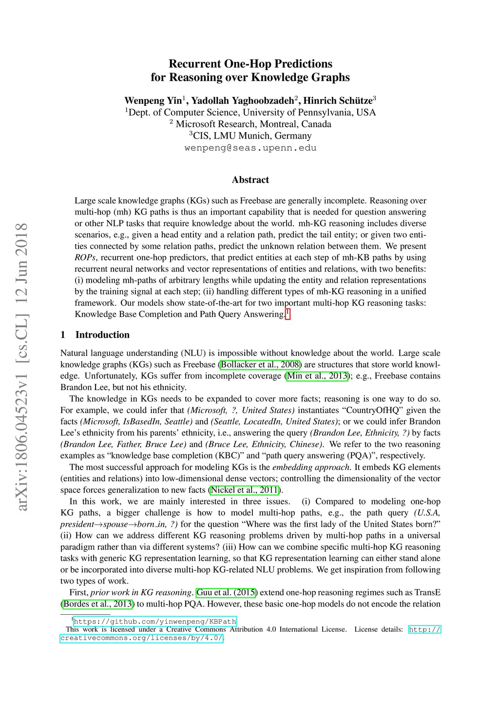 Recurrent One-Hop Predictions for Reasoning over Knowledge Graphs