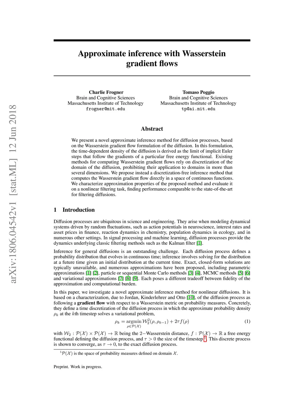 We present a novel approximate inference method for diffusion processes, based on the Wasserstein gradient flow formulation of the diffusion. In this formulation, the time-dependent density of the diffusion is derived as the limit of implicit Euler steps that follow the gradients of a particular free energy functional. Existing methods for computing Wasserstein gradient flows rely on discretization of the domain of the diffusion, prohibiting their application to domains in more than several dimensions. We propose instead a discretization-free inference method that computes the Wasserstein gradient flow directly in a space of continuous functions. We characterize approximation properties of the proposed method and evaluate it on a nonlinear filtering task, finding performance comparable to the state-of-the-art for filtering diffusions.