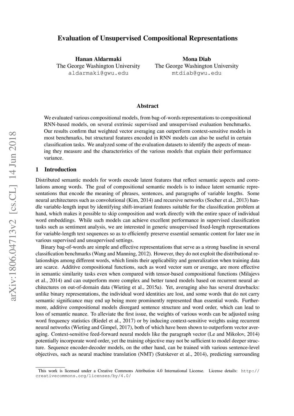 We evaluated various compositional models, from bag-of-words representations to compositional RNN-based models, on several extrinsic supervised and unsupervised evaluation benchmarks. Our results confirm that weighted vector averaging can outperform context-sensitive models in most benchmarks, but structural features encoded in RNN models can also be useful in certain classification tasks. We analyzed some of the evaluation datasets to identify the aspects of meaning they measure and the characteristics of the various models that explain their performance variance.