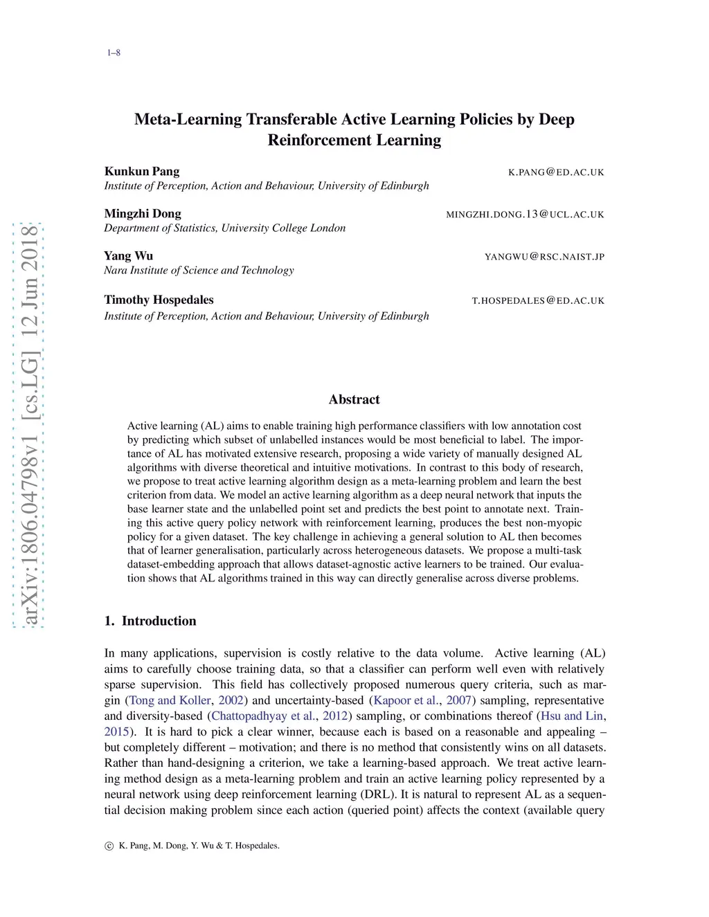 Active learning (AL) aims to enable training high performance classifiers with low annotation cost by predicting which subset of unlabelled instances would be most beneficial to label. The importance of AL has motivated extensive research, proposing a wide variety of manually designed AL algorithms with diverse theoretical and intuitive motivations. In contrast to this body of research, we propose to treat active learning algorithm design as a meta-learning problem and learn the best criterion from data. We model an active learning algorithm as a deep neural network that inputs the base learner state and the unlabelled point set and predicts the best point to annotate next. Training this active query policy network with reinforcement learning, produces the best non-myopic policy for a given dataset. The key challenge in achieving a general solution to AL then becomes that of learner generalisation, particularly across heterogeneous datasets. We propose a multi-task dataset-embedding approach that allows dataset-agnostic active learners to be trained. Our evaluation shows that AL algorithms trained in this way can directly generalise across diverse problems.