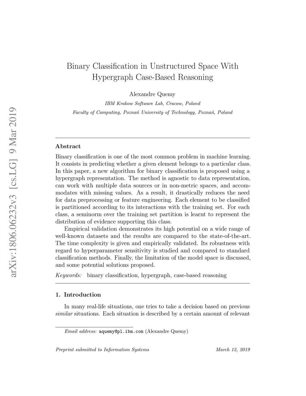Binary classification is one of the most common problem in machine learning. It consists in predicting whether a given element belongs to a particular class. In this paper, a new algorithm for binary classification is proposed using a hypergraph representation. The method is agnostic to data representation, can work with multiple data sources or in non-metric spaces, and accommodates with missing values. As a result, it drastically reduces the need for data preprocessing or feature engineering. Each element to be classified is partitioned according to its interactions with the training set. For each class, a seminorm over the training set partition is learnt to represent the distribution of evidence supporting this class. Empirical validation demonstrates its high potential on a wide range of well-known datasets and the results are compared to the state-of-the-art. The time complexity is given and empirically validated. Its robustness with regard to hyperparameter sensitivity is studied and compared to standard classification methods. Finally, the limitation of the model space is discussed, and some potential solutions proposed.