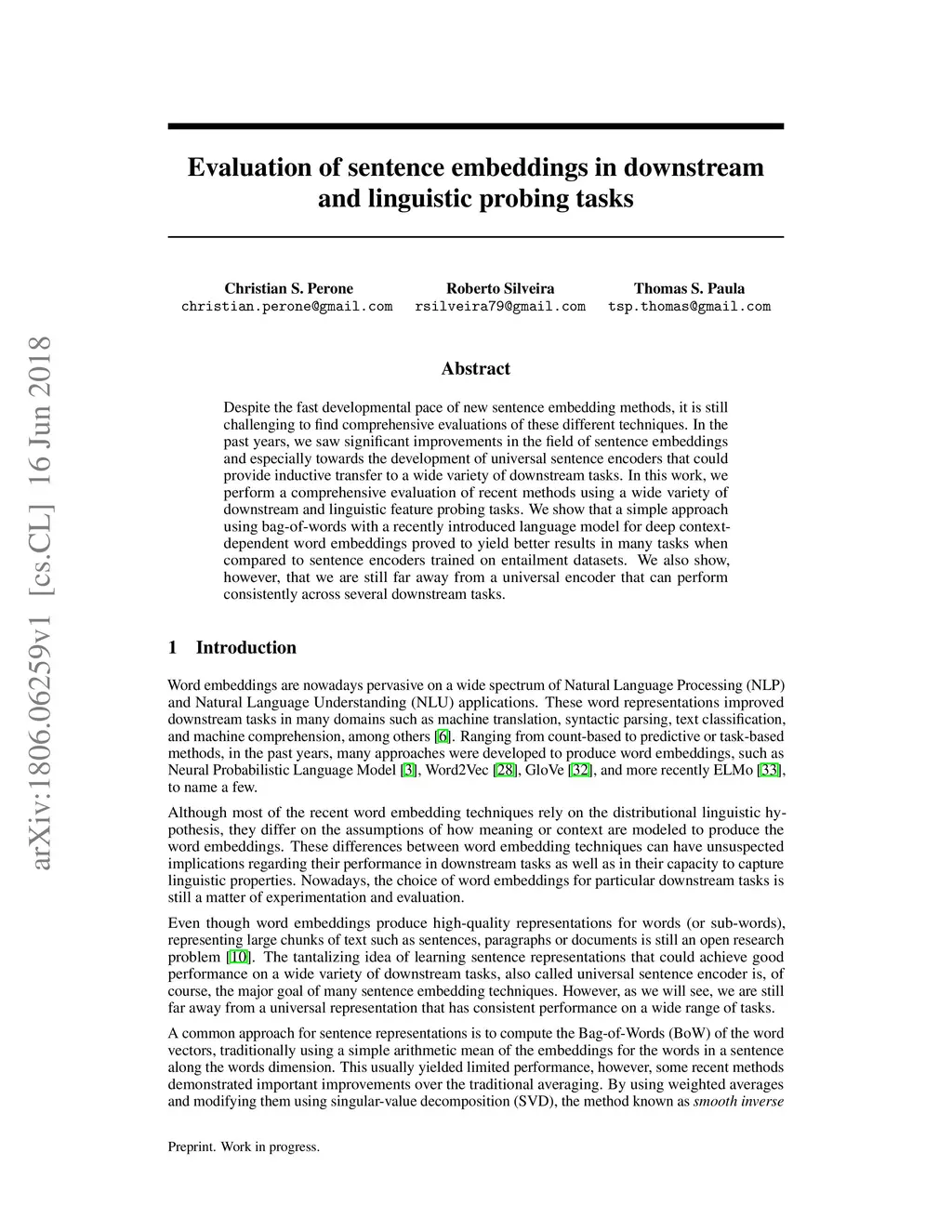 Evaluation of sentence embeddings in downstream and linguistic probing