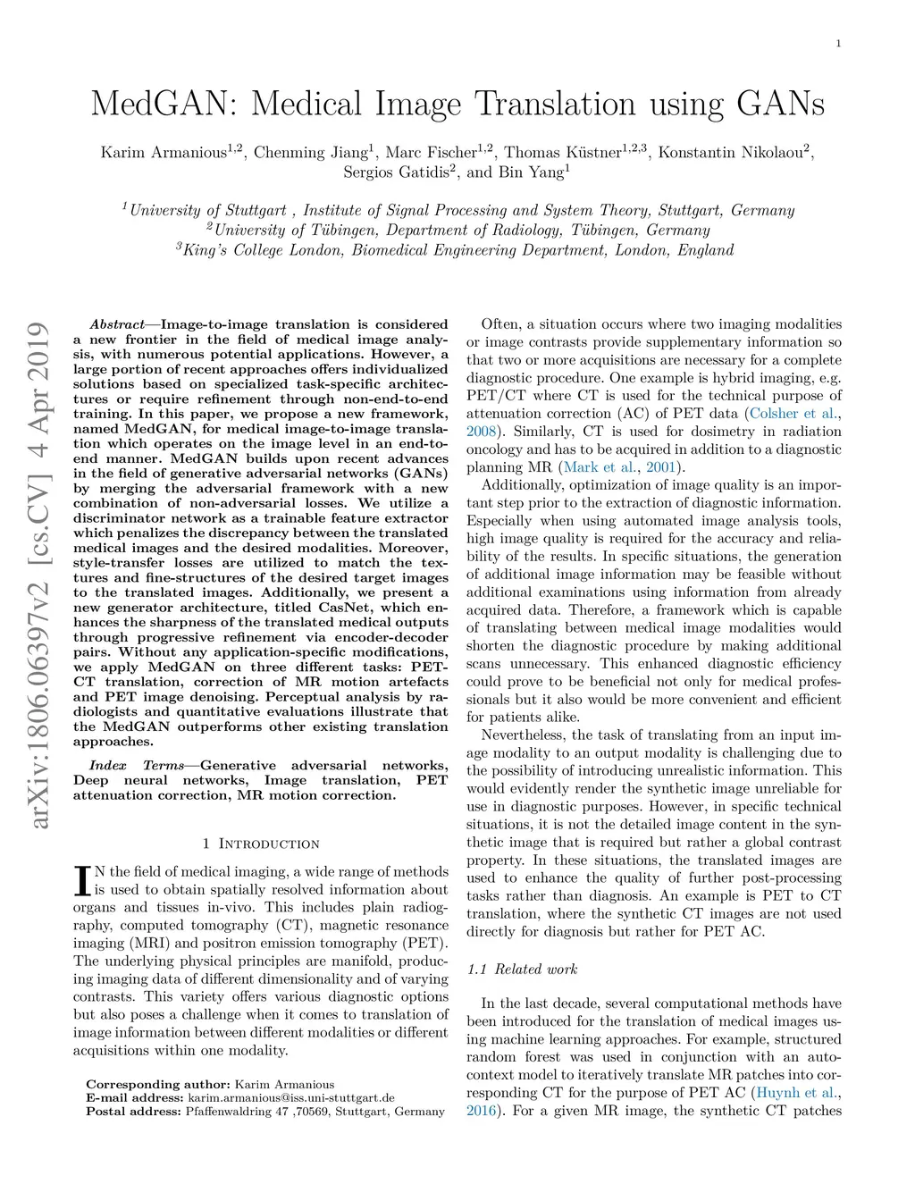 Image-to-image translation is considered a new frontier in the field of medical image analysis, with numerous potential applications. However, a large portion of recent approaches offers individualized solutions based on specialized task-specific architectures or require refinement through non-end-to-end training. In this paper, we propose a new framework, named MedGAN, for medical image-to-image translation which operates on the image level in an end-to-end manner. MedGAN builds upon recent advances in the field of generative adversarial networks (GANs) by merging the adversarial framework with a new combination of non-adversarial losses. We utilize a discriminator network as a trainable feature extractor which penalizes the discrepancy between the translated medical images and the desired modalities. Moreover, style-transfer losses are utilized to match the textures and fine-structures of the desired target images to the translated images. Additionally, we present a new generator architecture, titled CasNet, which enhances the sharpness of the translated medical outputs through progressive refinement via encoder-decoder pairs. Without any application-specific modifications, we apply MedGAN on three different tasks: PET-CT translation, correction of MR motion artefacts and PET image denoising. Perceptual analysis by radiologists and quantitative evaluations illustrate that the MedGAN outperforms other existing translation approaches.