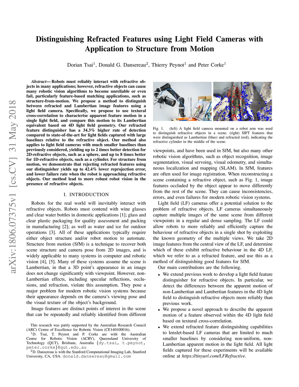 Robots must reliably interact with refractive objects in many applications; however, refractive objects can cause many robotic vision algorithms to become unreliable or even fail, particularly feature-based matching applications, such as structure-from-motion. We propose a method to distinguish between refracted and Lambertian image features using a light field camera. Specifically, we propose to use textural cross-correlation to characterise apparent feature motion in a single light field, and compare this motion to its Lambertian equivalent based on 4D light field geometry. Our refracted feature distinguisher has a 34.3% higher rate of detection compared to state-of-the-art for light fields captured with large baselines relative to the refractive object. Our method also applies to light field cameras with much smaller baselines than previously considered, yielding up to 2 times better detection for 2D-refractive objects, such as a sphere, and up to 8 times better for 1D-refractive objects, such as a cylinder. For structure from motion, we demonstrate that rejecting refracted features using our distinguisher yields up to 42.4% lower reprojection error, and lower failure rate when the robot is approaching refractive objects. Our method lead to more robust robot vision in the presence of refractive objects.