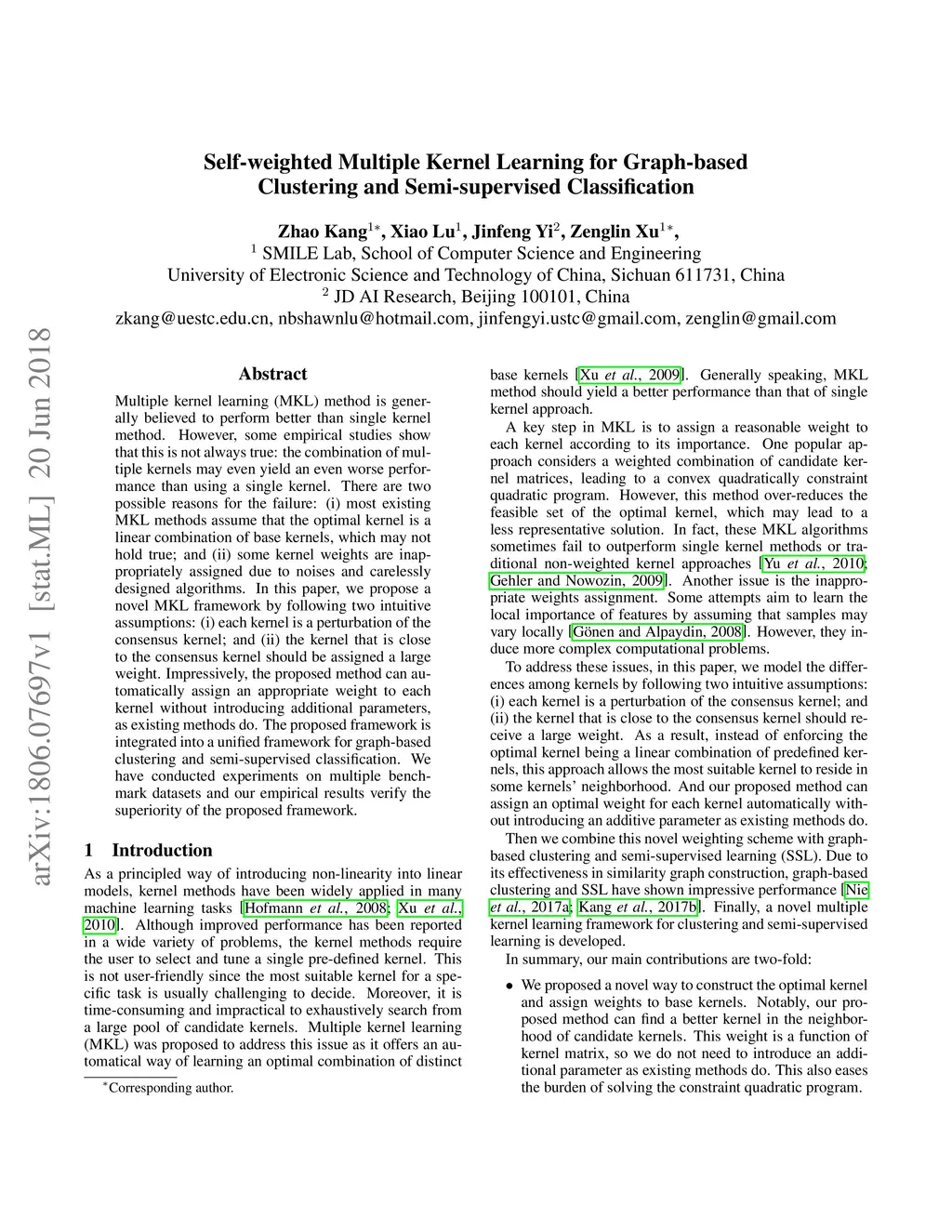 Self-weighted Multiple Kernel Learning for Graph-based Clustering and