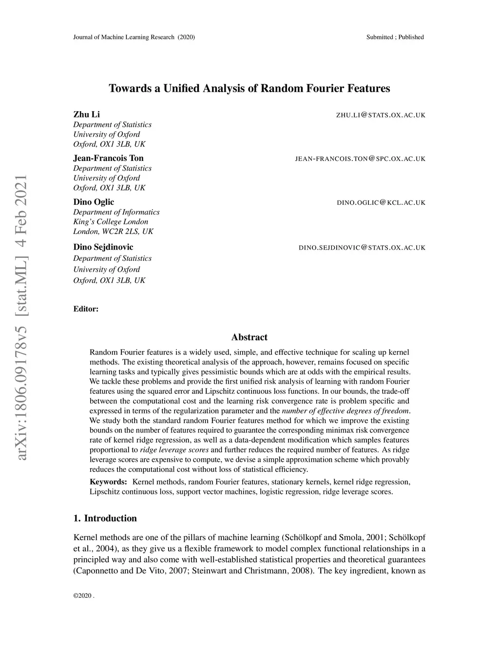 Random Fourier features is a widely used, simple, and effective technique for scaling up kernel methods. The existing theoretical analysis of the approach, however, remains focused on specific learning tasks and typically gives pessimistic bounds which are at odds with the empirical results. We tackle these problems and provide the first unified risk analysis of learning with random Fourier features using the squared error and Lipschitz continuous loss functions. In our bounds, the trade-off between the computational cost and the expected risk convergence rate is problem specific and expressed in terms of the regularization parameter and the \emph{number of effective degrees of freedom}. We study both the standard random Fourier features method for which we improve the existing bounds on the number of features required to guarantee the corresponding minimax risk convergence rate of kernel ridge regression, as well as a data-dependent modification which samples features proportional to \emph{ridge leverage scores} and further reduces the required number of features. As ridge leverage scores are expensive to compute, we devise a simple approximation scheme which provably reduces the computational cost without loss of statistical efficiency.