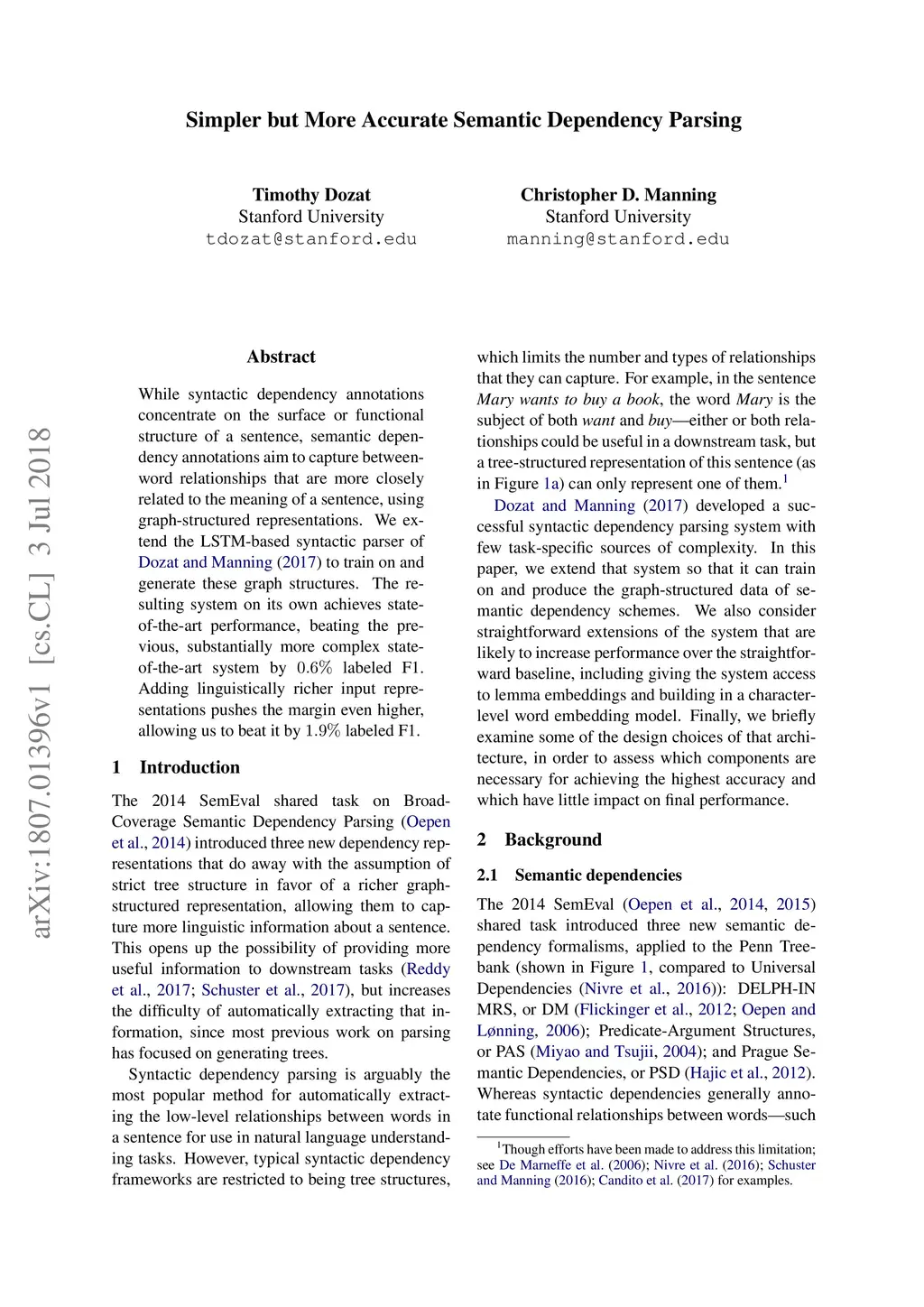While syntactic dependency annotations concentrate on the surface or functional structure of a sentence, semantic dependency annotations aim to capture between-word relationships that are more closely related to the meaning of a sentence, using graph-structured representations. We extend the LSTM-based syntactic parser of Dozat and Manning (2017) to train on and generate these graph structures. The resulting system on its own achieves state-of-the-art performance, beating the previous, substantially more complex state-of-the-art system by 0.6% labeled F1. Adding linguistically richer input representations pushes the margin even higher, allowing us to beat it by 1.9% labeled F1.