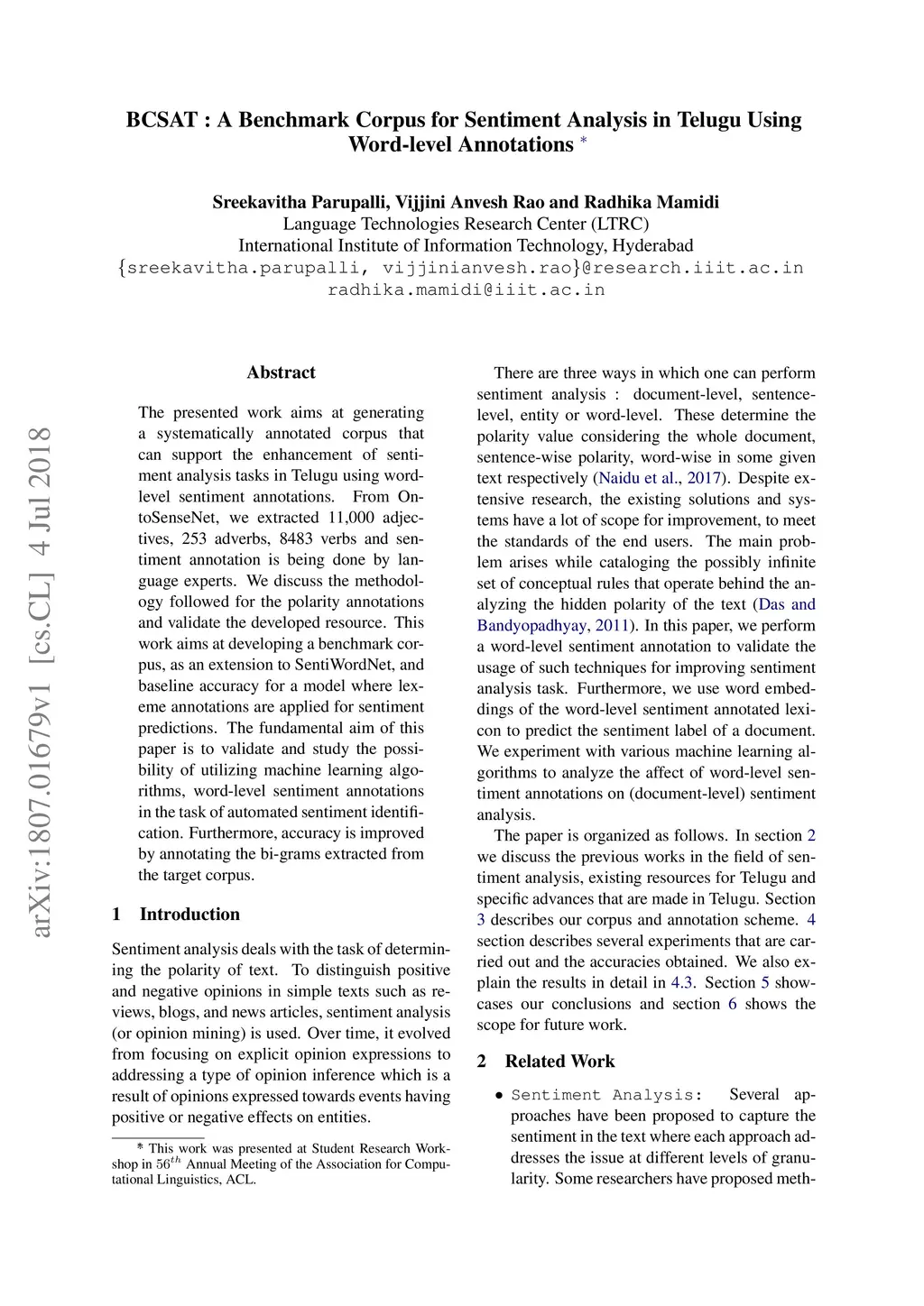 BCSAT : A Benchmark Corpus for Sentiment Analysis in Telugu Using