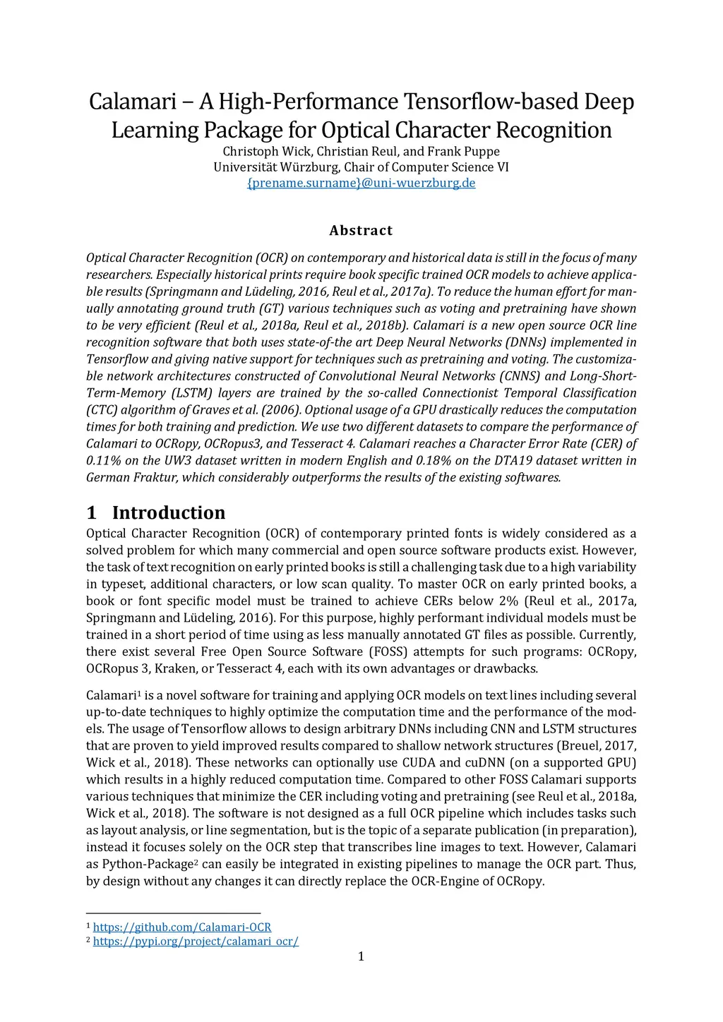 Optical Character Recognition (OCR) on contemporary and historical data is still in the focus of many researchers. Especially historical prints require book specific trained OCR models to achieve applicable results (Springmann and L\"udeling, 2016, Reul et al., 2017a). To reduce the human effort for manually annotating ground truth (GT) various techniques such as voting and pretraining have shown to be very efficient (Reul et al., 2018a, Reul et al., 2018b). Calamari is a new open source OCR line recognition software that both uses state-of-the art Deep Neural Networks (DNNs) implemented in Tensorflow and giving native support for techniques such as pretraining and voting. The customizable network architectures constructed of Convolutional Neural Networks (CNNS) and Long-ShortTerm-Memory (LSTM) layers are trained by the so-called Connectionist Temporal Classification (CTC) algorithm of Graves et al. (2006). Optional usage of a GPU drastically reduces the computation times for both training and prediction. We use two different datasets to compare the performance of Calamari to OCRopy, OCRopus3, and Tesseract 4. Calamari reaches a Character Error Rate (CER) of 0.11% on the UW3 dataset written in modern English and 0.18% on the DTA19 dataset written in German Fraktur, which considerably outperforms the results of the existing softwares.