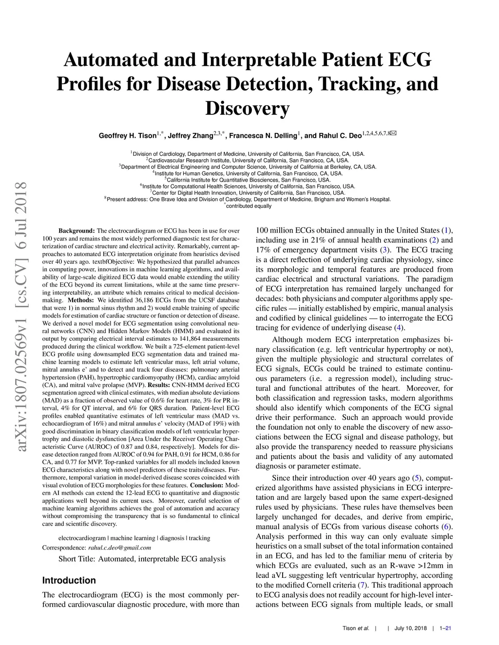 The electrocardiogram or ECG has been in use for over 100 years and remains the most widely performed diagnostic test to characterize cardiac structure and electrical activity. We hypothesized that parallel advances in computing power, innovations in machine learning algorithms, and availability of large-scale digitized ECG data would enable extending the utility of the ECG beyond its current limitations, while at the same time preserving interpretability, which is fundamental to medical decision-making. We identified 36,186 ECGs from the UCSF database that were 1) in normal sinus rhythm and 2) would enable training of specific models for estimation of cardiac structure or function or detection of disease. We derived a novel model for ECG segmentation using convolutional neural networks (CNN) and Hidden Markov Models (HMM) and evaluated its output by comparing electrical interval estimates to 141,864 measurements from the clinical workflow. We built a 725-element patient-level ECG profile using downsampled segmentation data and trained machine learning models to estimate left ventricular mass, left atrial volume, mitral annulus e' and to detect and track four diseases: pulmonary arterial hypertension (PAH), hypertrophic cardiomyopathy (HCM), cardiac amyloid (CA), and mitral valve prolapse (MVP). CNN-HMM derived ECG segmentation agreed with clinical estimates, with median absolute deviations (MAD) as a fraction of observed value of 0.6% for heart rate and 4% for QT interval. Patient-level ECG profiles enabled quantitative estimates of left ventricular and mitral annulus e' velocity with good discrimination in binary classification models of left ventricular hypertrophy and diastolic function. Models for disease detection ranged from AUROC of 0.94 to 0.77 for MVP. Top-ranked variables for all models included known ECG characteristics along with novel predictors of these traits/diseases.