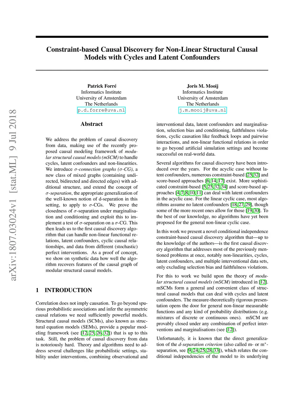 We address the problem of causal discovery from data, making use of the recently proposed causal modeling framework of modular structural causal models (mSCM) to handle cycles, latent confounders and non-linearities. We introduce {\sigma}-connection graphs ({\sigma}-CG), a new class of mixed graphs (containing undirected, bidirected and directed edges) with additional structure, and extend the concept of {\sigma}-separation, the appropriate generalization of the well-known notion of d-separation in this setting, to apply to {\sigma}-CGs. We prove the closedness of {\sigma}-separation under marginalisation and conditioning and exploit this to implement a test of {\sigma}-separation on a {\sigma}-CG. This then leads us to the first causal discovery algorithm that can handle non-linear functional relations, latent confounders, cyclic causal relationships, and data from different (stochastic) perfect interventions. As a proof of concept, we show on synthetic data how well the algorithm recovers features of the causal graph of modular structural causal models.