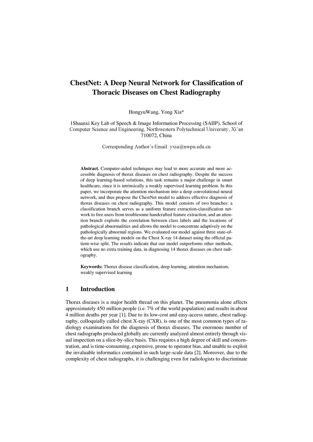Computer-aided techniques may lead to more accurate and more acces-sible diagnosis of thorax diseases on chest radiography. Despite the success of deep learning-based solutions, this task remains a major challenge in smart healthcare, since it is intrinsically a weakly supervised learning problem. In this paper, we incorporate the attention mechanism into a deep convolutional neural network, and thus propose the ChestNet model to address effective diagnosis of thorax diseases on chest radiography. This model consists of two branches: a classification branch serves as a uniform feature extraction-classification network to free users from troublesome handcrafted feature extraction, and an attention branch exploits the correlation between class labels and the locations of patholog-ical abnormalities and allows the model to concentrate adaptively on the patholog-ically abnormal regions. We evaluated our model against three state-of-the-art deep learning models on the Chest X-ray 14 dataset using the official patient-wise split. The results indicate that our model outperforms other methods, which use no extra training data, in diagnosing 14 thorax diseases on chest radiography.