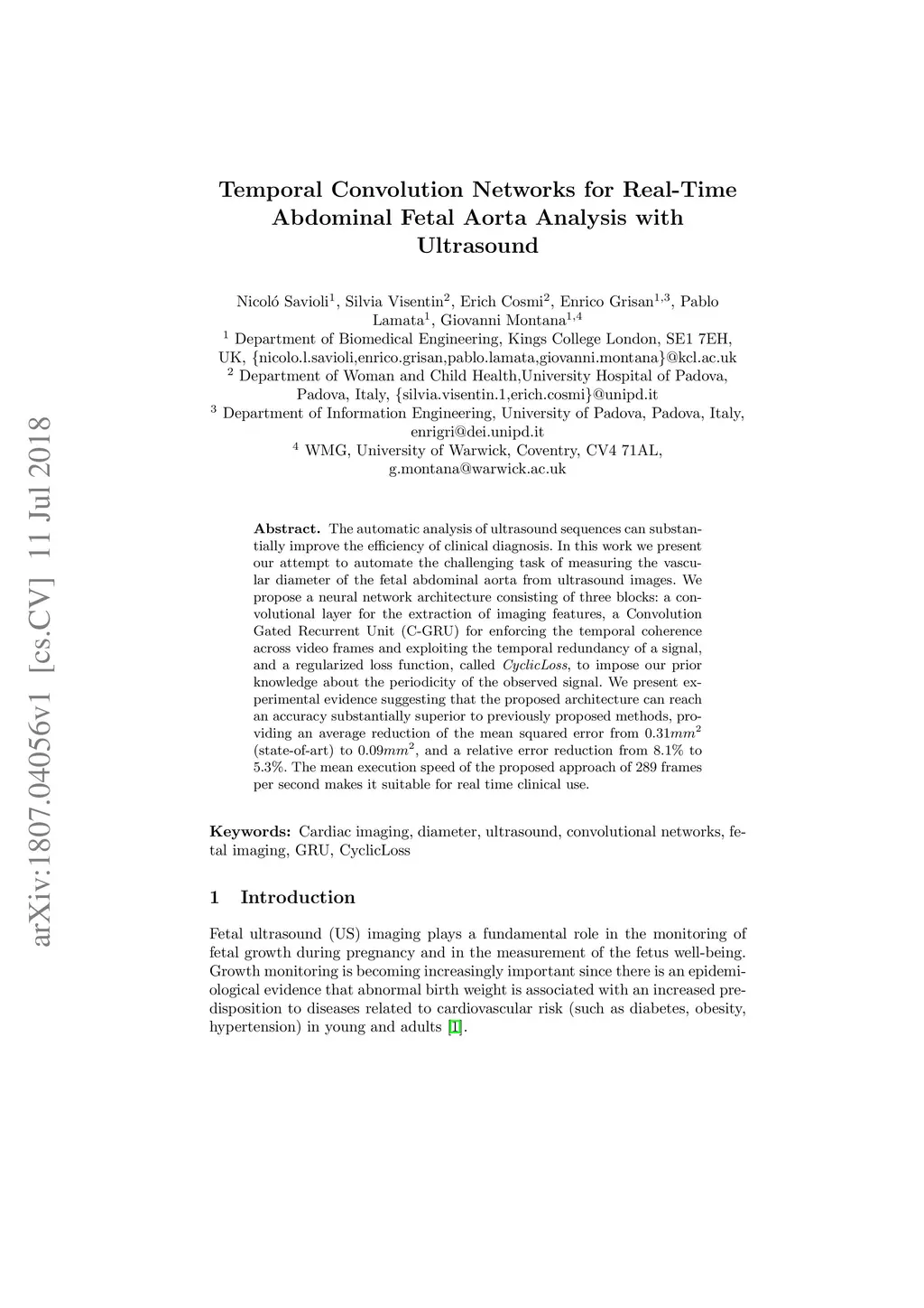The automatic analysis of ultrasound sequences can substantially improve the efficiency of clinical diagnosis. In this work we present our attempt to automate the challenging task of measuring the vascular diameter of the fetal abdominal aorta from ultrasound images. We propose a neural network architecture consisting of three blocks: a convolutional layer for the extraction of imaging features, a Convolution Gated Recurrent Unit (C-GRU) for enforcing the temporal coherence across video frames and exploiting the temporal redundancy of a signal, and a regularized loss function, called \textit{CyclicLoss}, to impose our prior knowledge about the periodicity of the observed signal. We present experimental evidence suggesting that the proposed architecture can reach an accuracy substantially superior to previously proposed methods, providing an average reduction of the mean squared error from (state-of-art) to , and a relative error reduction from to . The mean execution speed of the proposed approach of 289 frames per second makes it suitable for real time clinical use.