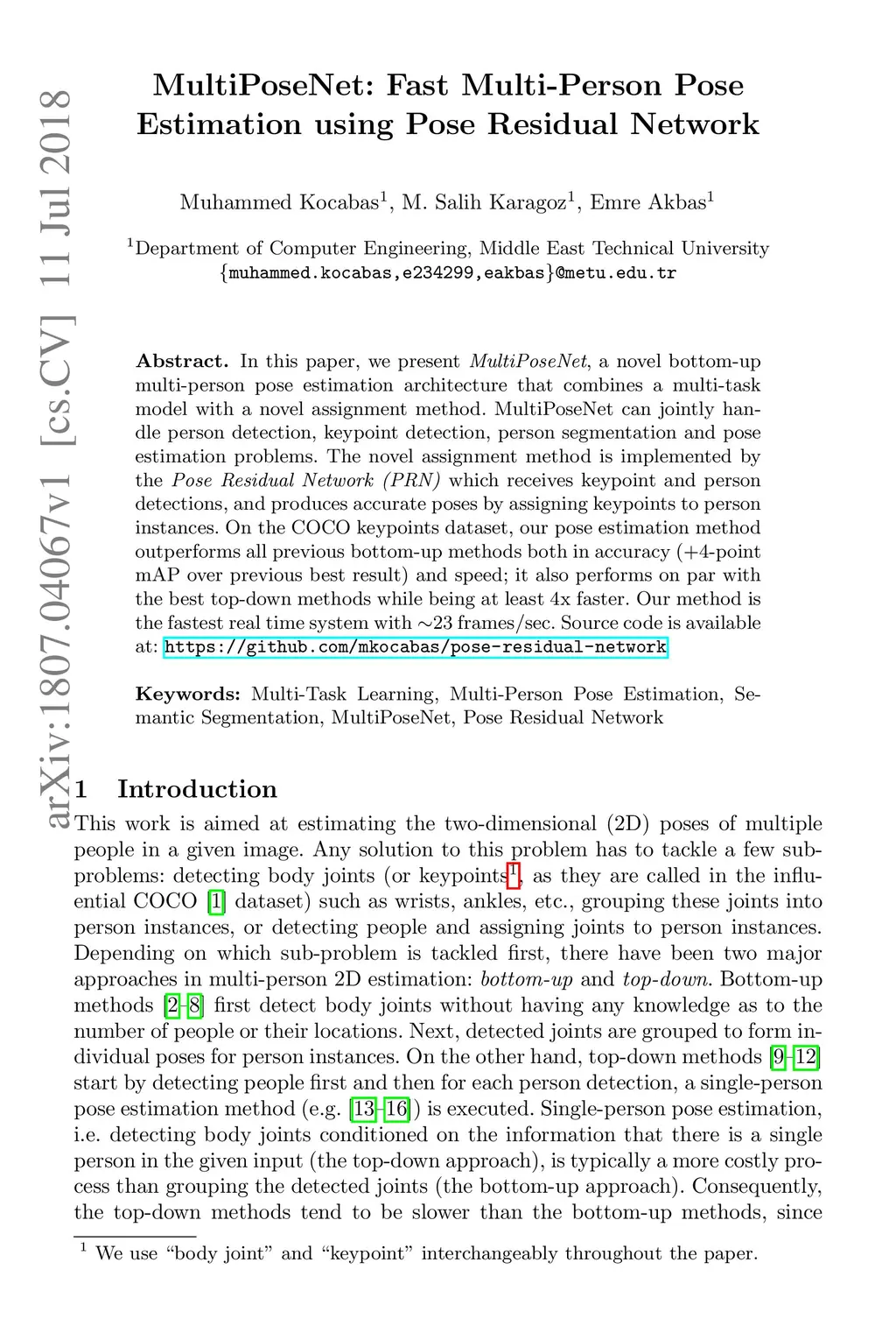 MultiPoseNet: Fast Multi-Person Pose Estimation using Pose Residual