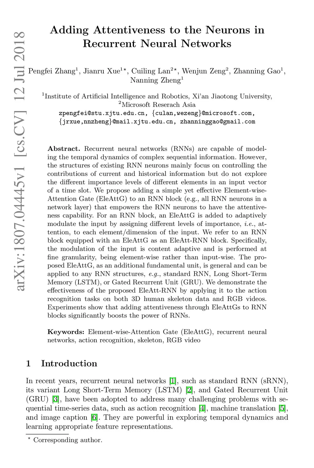 Recurrent neural networks (RNNs) are capable of modeling the temporal dynamics of complex sequential information. However, the structures of existing RNN neurons mainly focus on controlling the contributions of current and historical information but do not explore the different importance levels of different elements in an input vector of a time slot. We propose adding a simple yet effective Element-wiseAttention Gate (EleAttG) to an RNN block (e.g., all RNN neurons in a network layer) that empowers the RNN neurons to have the attentiveness capability. For an RNN block, an EleAttG is added to adaptively modulate the input by assigning different levels of importance, i.e., attention, to each element/dimension of the input. We refer to an RNN block equipped with an EleAttG as an EleAtt-RNN block. Specifically, the modulation of the input is content adaptive and is performed at fine granularity, being element-wise rather than input-wise. The proposed EleAttG, as an additional fundamental unit, is general and can be applied to any RNN structures, e.g., standard RNN, Long Short-Term Memory (LSTM), or Gated Recurrent Unit (GRU). We demonstrate the effectiveness of the proposed EleAtt-RNN by applying it to the action recognition tasks on both 3D human skeleton data and RGB videos. Experiments show that adding attentiveness through EleAttGs to RNN blocks significantly boosts the power of RNNs.