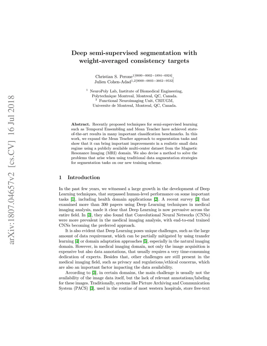 Recently proposed techniques for semi-supervised learning such as Temporal Ensembling and Mean Teacher have achieved state-of-the-art results in many important classification benchmarks. In this work, we expand the Mean Teacher approach to segmentation tasks and show that it can bring important improvements in a realistic small data regime using a publicly available multi-center dataset from the Magnetic Resonance Imaging (MRI) domain. We also devise a method to solve the problems that arise when using traditional data augmentation strategies for segmentation tasks on our new training scheme.
