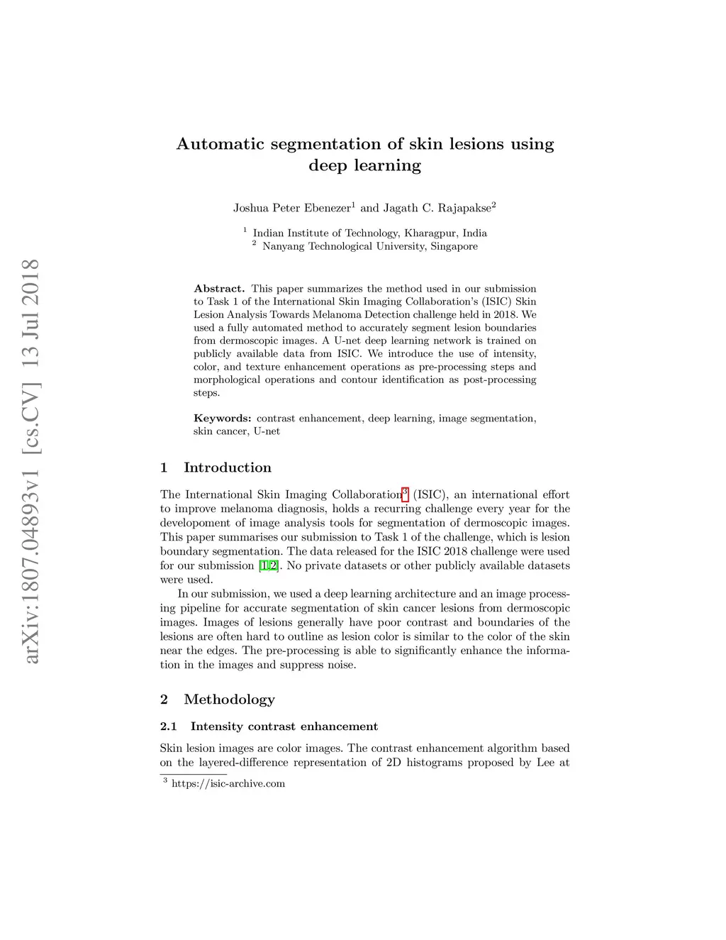 This paper summarizes the method used in our submission to Task 1 of the International Skin Imaging Collaboration's (ISIC) Skin Lesion Analysis Towards Melanoma Detection challenge held in 2018. We used a fully automated method to accurately segment lesion boundaries from dermoscopic images. A U-net deep learning network is trained on publicly available data from ISIC. We introduce the use of intensity, color, and texture enhancement operations as pre-processing steps and morphological operations and contour identification as post-processing steps.