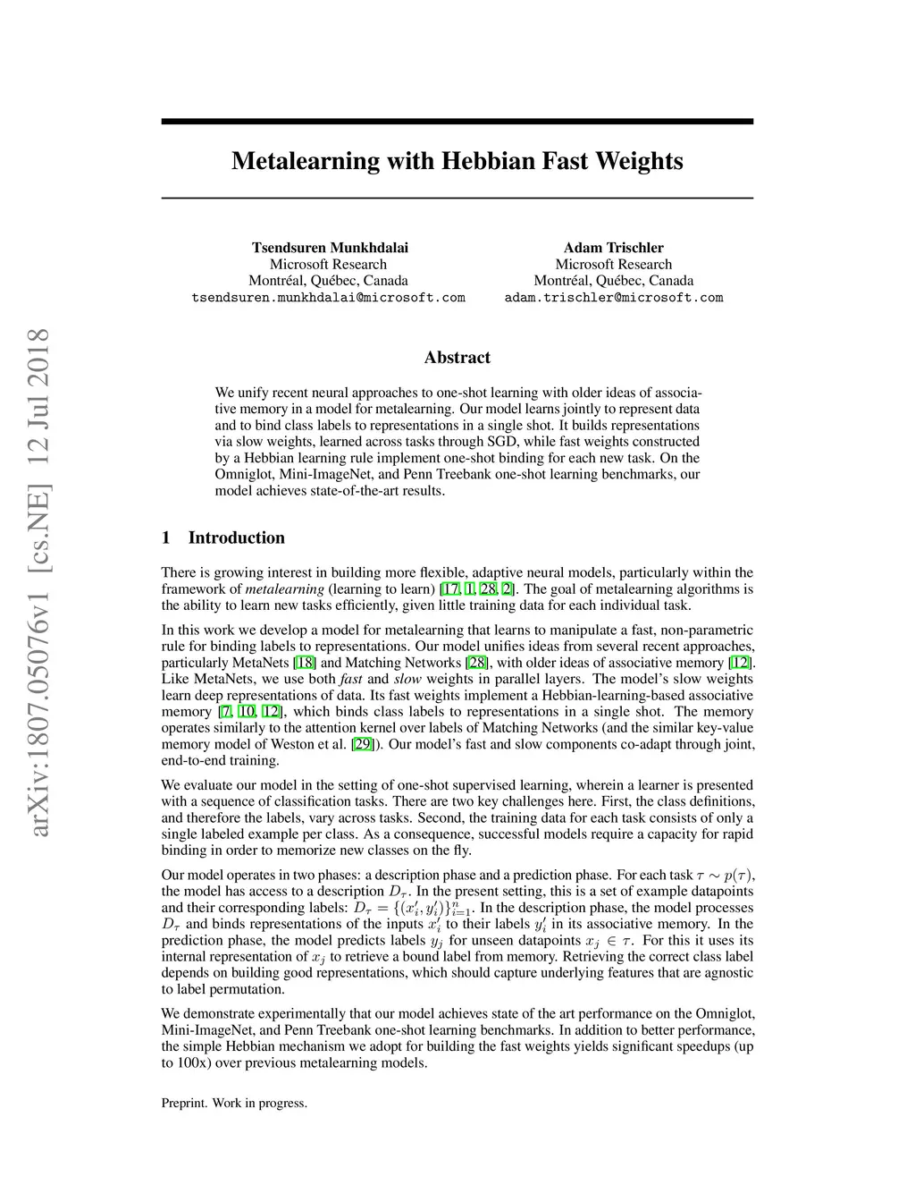 We unify recent neural approaches to one-shot learning with older ideas of associative memory in a model for metalearning. Our model learns jointly to represent data and to bind class labels to representations in a single shot. It builds representations via slow weights, learned across tasks through SGD, while fast weights constructed by a Hebbian learning rule implement one-shot binding for each new task. On the Omniglot, Mini-ImageNet, and Penn Treebank one-shot learning benchmarks, our model achieves state-of-the-art results.
