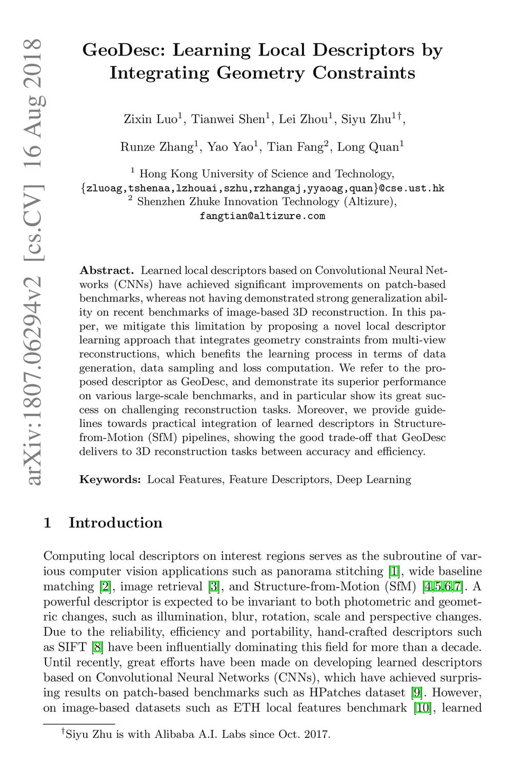 GeoDesc: Learning Local Descriptors by Integrating Geometry Constraints
