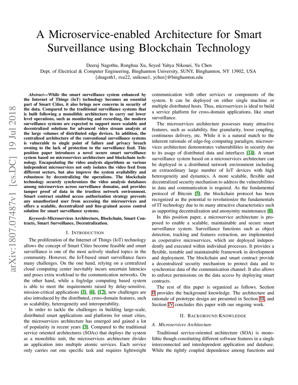 While the smart surveillance system enhanced by the Internet of Things (IoT) technology becomes an essential part of Smart Cities, it also brings new concerns in security of the data. Compared to the traditional surveillance systems that is built following a monolithic architecture to carry out lower level operations, such as monitoring and recording, the modern surveillance systems are expected to support more scalable and decentralized solutions for advanced video stream analysis at the large volumes of distributed edge devices. In addition, the centralized architecture of the conventional surveillance systems is vulnerable to single point of failure and privacy breach owning to the lack of protection to the surveillance feed. This position paper introduces a novel secure smart surveillance system based on microservices architecture and blockchain technology. Encapsulating the video analysis algorithms as various independent microservices not only isolates the video feed from different sectors, but also improve the system availability and robustness by decentralizing the operations. The blockchain technology securely synchronizes the video analysis databases among microservices across surveillance domains, and provides tamper proof of data in the trustless network environment. Smart contract enabled access authorization strategy prevents any unauthorized user from accessing the microservices and offers a scalable, decentralized and fine-grained access control solution for smart surveillance systems.