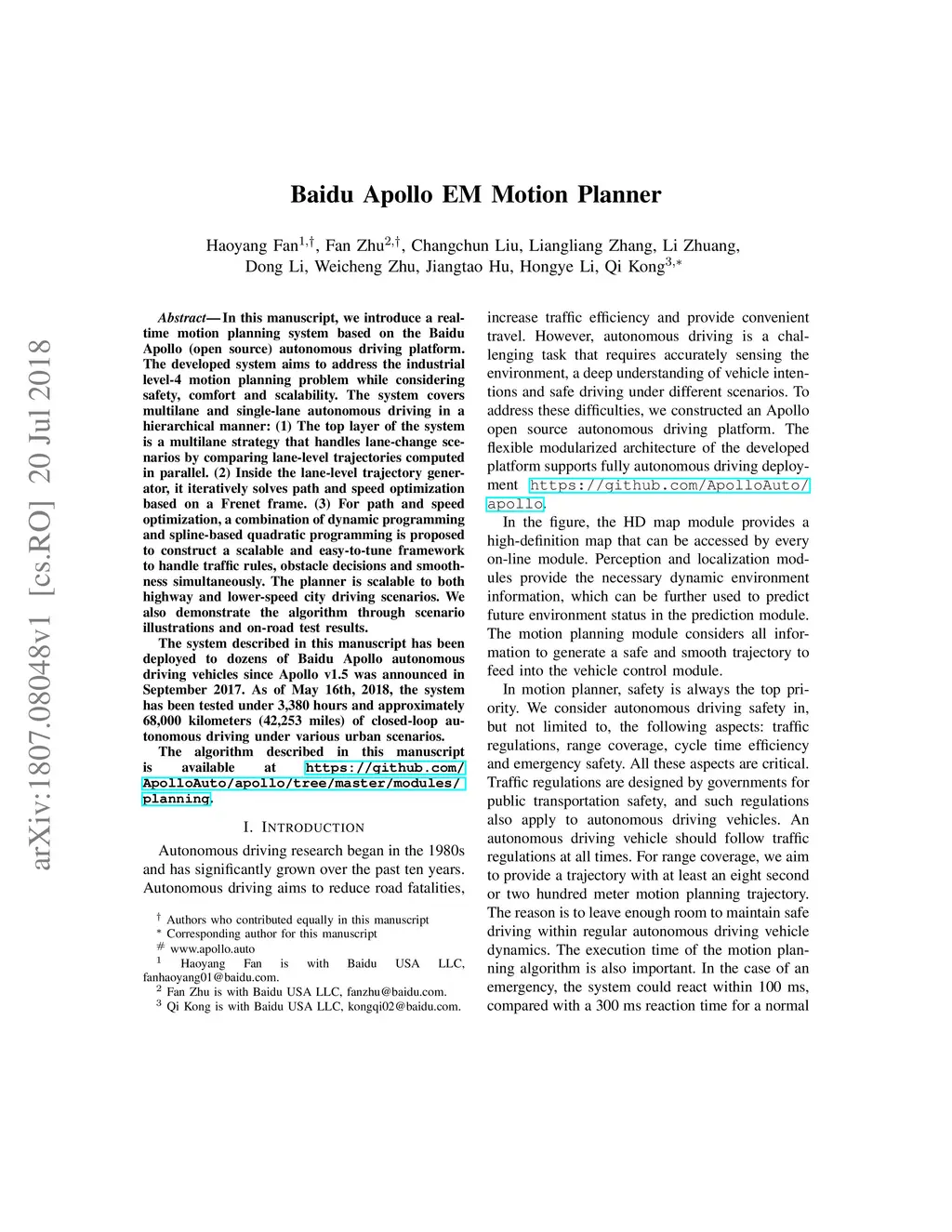 In this manuscript, we introduce a real-time motion planning system based on the Baidu Apollo (open source) autonomous driving platform. The developed system aims to address the industrial level-4 motion planning problem while considering safety, comfort and scalability. The system covers multilane and single-lane autonomous driving in a hierarchical manner: (1) The top layer of the system is a multilane strategy that handles lane-change scenarios by comparing lane-level trajectories computed in parallel. (2) Inside the lane-level trajectory generator, it iteratively solves path and speed optimization based on a Frenet frame. (3) For path and speed optimization, a combination of dynamic programming and spline-based quadratic programming is proposed to construct a scalable and easy-to-tune framework to handle traffic rules, obstacle decisions and smoothness simultaneously. The planner is scalable to both highway and lower-speed city driving scenarios. We also demonstrate the algorithm through scenario illustrations and on-road test results. The system described in this manuscript has been deployed to dozens of Baidu Apollo autonomous driving vehicles since Apollo v1.5 was announced in September 2017. As of May 16th, 2018, the system has been tested under 3,380 hours and approximately 68,000 kilometers (42,253 miles) of closed-loop autonomous driving under various urban scenarios. The algorithm described in this manuscript is available at https://github.com/ApolloAuto/apollo/tree/master/modules/planning.