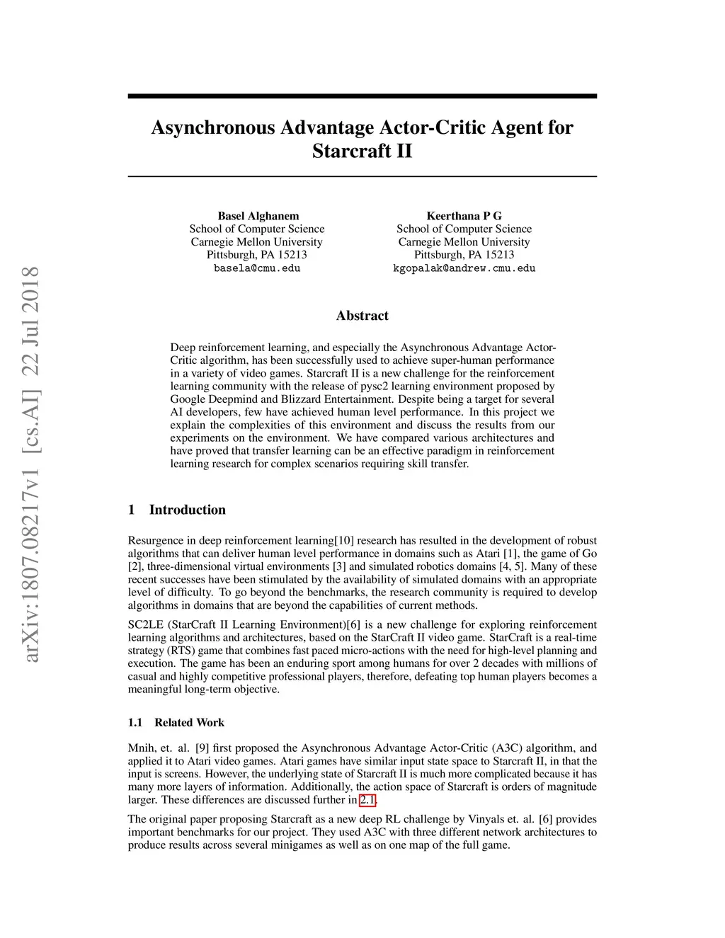 Deep reinforcement learning, and especially the Asynchronous Advantage Actor-Critic algorithm, has been successfully used to achieve super-human performance in a variety of video games. Starcraft II is a new challenge for the reinforcement learning community with the release of pysc2 learning environment proposed by Google Deepmind and Blizzard Entertainment. Despite being a target for several AI developers, few have achieved human level performance. In this project we explain the complexities of this environment and discuss the results from our experiments on the environment. We have compared various architectures and have proved that transfer learning can be an effective paradigm in reinforcement learning research for complex scenarios requiring skill transfer.