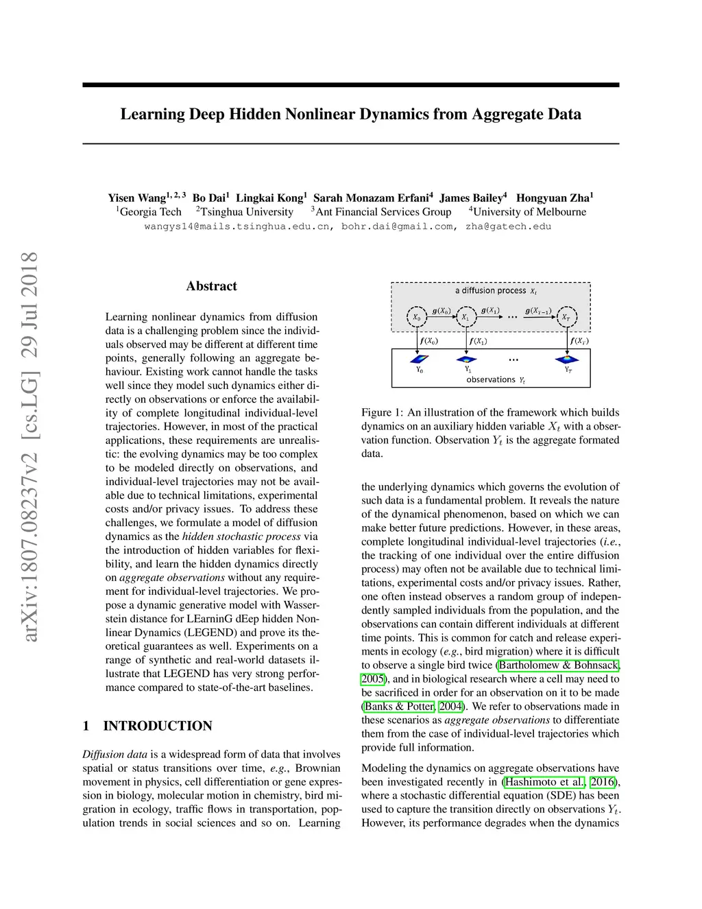 Learning nonlinear dynamics from diffusion data is a challenging problem since the individuals observed may be different at different time points, generally following an aggregate behaviour. Existing work cannot handle the tasks well since they model such dynamics either directly on observations or enforce the availability of complete longitudinal individual-level trajectories. However, in most of the practical applications, these requirements are unrealistic: the evolving dynamics may be too complex to be modeled directly on observations, and individual-level trajectories may not be available due to technical limitations, experimental costs and/or privacy issues. To address these challenges, we formulate a model of diffusion dynamics as the {\em hidden stochastic process} via the introduction of hidden variables for flexibility, and learn the hidden dynamics directly on {\em aggregate observations} without any requirement for individual-level trajectories. We propose a dynamic generative model with Wasserstein distance for LEarninG dEep hidden Nonlinear Dynamics (LEGEND) and prove its theoretical guarantees as well. Experiments on a range of synthetic and real-world datasets illustrate that LEGEND has very strong performance compared to state-of-the-art baselines.