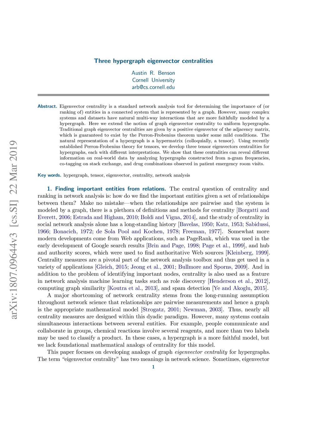 Eigenvector centrality is a standard network analysis tool for determining the importance of (or ranking of) entities in a connected system that is represented by a graph. However, many complex systems and datasets have natural multi-way interactions that are more faithfully modeled by a hypergraph. Here we extend the notion of graph eigenvector centrality to uniform hypergraphs. Traditional graph eigenvector centralities are given by a positive eigenvector of the adjacency matrix, which is guaranteed to exist by the Perron-Frobenius theorem under some mild conditions. The natural representation of a hypergraph is a hypermatrix (colloquially, a tensor). Using recently established Perron-Frobenius theory for tensors, we develop three tensor eigenvectors centralities for hypergraphs, each with different interpretations. We show that these centralities can reveal different information on real-world data by analyzing hypergraphs constructed from n-gram frequencies, co-tagging on stack exchange, and drug combinations observed in patient emergency room visits.