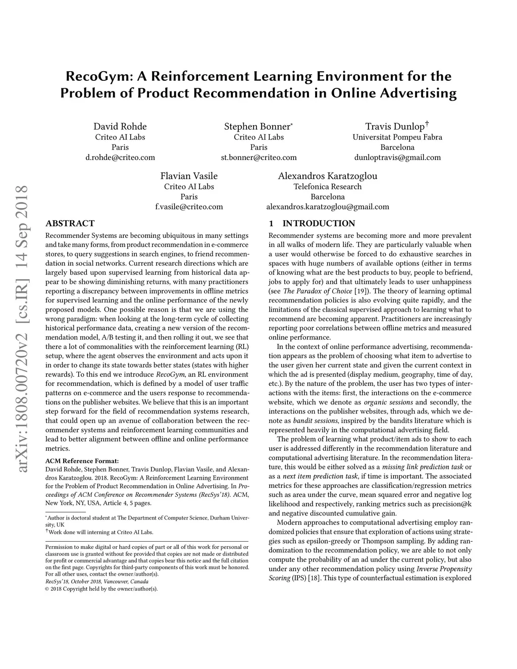 Recommender Systems are becoming ubiquitous in many settings and take many forms, from product recommendation in e-commerce stores, to query suggestions in search engines, to friend recommendation in social networks. Current research directions which are largely based upon supervised learning from historical data appear to be showing diminishing returns with a lot of practitioners report a discrepancy between improvements in offline metrics for supervised learning and the online performance of the newly proposed models. One possible reason is that we are using the wrong paradigm: when looking at the long-term cycle of collecting historical performance data, creating a new version of the recommendation model, A/B testing it and then rolling it out. We see that there a lot of commonalities with the reinforcement learning (RL) setup, where the agent observes the environment and acts upon it in order to change its state towards better states (states with higher rewards). To this end we introduce RecoGym, an RL environment for recommendation, which is defined by a model of user traffic patterns on e-commerce and the users response to recommendations on the publisher websites. We believe that this is an important step forward for the field of recommendation systems research, that could open up an avenue of collaboration between the recommender systems and reinforcement learning communities and lead to better alignment between offline and online performance metrics.