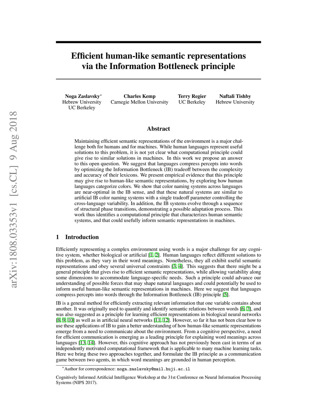 Maintaining efficient semantic representations of the environment is a major challenge both for humans and for machines. While human languages represent useful solutions to this problem, it is not yet clear what computational principle could give rise to similar solutions in machines. In this work we propose an answer to this open question. We suggest that languages compress percepts into words by optimizing the Information Bottleneck (IB) tradeoff between the complexity and accuracy of their lexicons. We present empirical evidence that this principle may give rise to human-like semantic representations, by exploring how human languages categorize colors. We show that color naming systems across languages are near-optimal in the IB sense, and that these natural systems are similar to artificial IB color naming systems with a single tradeoff parameter controlling the cross-language variability. In addition, the IB systems evolve through a sequence of structural phase transitions, demonstrating a possible adaptation process. This work thus identifies a computational principle that characterizes human semantic systems, and that could usefully inform semantic representations in machines.