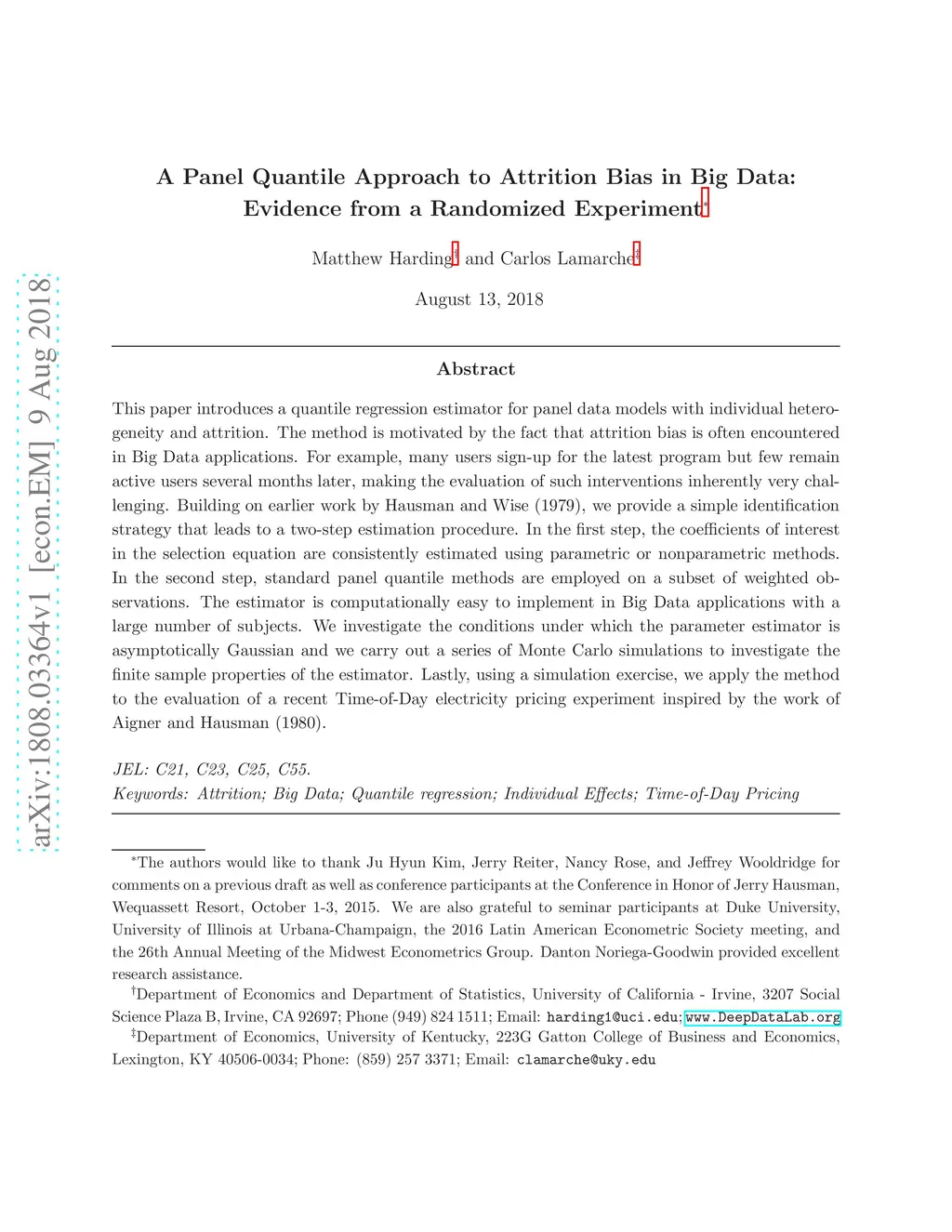 This paper introduces a quantile regression estimator for panel data models with individual heterogeneity and attrition. The method is motivated by the fact that attrition bias is often encountered in Big Data applications. For example, many users sign-up for the latest program but few remain active users several months later, making the evaluation of such interventions inherently very challenging. Building on earlier work by Hausman and Wise (1979), we provide a simple identification strategy that leads to a two-step estimation procedure. In the first step, the coefficients of interest in the selection equation are consistently estimated using parametric or nonparametric methods. In the second step, standard panel quantile methods are employed on a subset of weighted observations. The estimator is computationally easy to implement in Big Data applications with a large number of subjects. We investigate the conditions under which the parameter estimator is asymptotically Gaussian and we carry out a series of Monte Carlo simulations to investigate the finite sample properties of the estimator. Lastly, using a simulation exercise, we apply the method to the evaluation of a recent Time-of-Day electricity pricing experiment inspired by the work of Aigner and Hausman (1980).