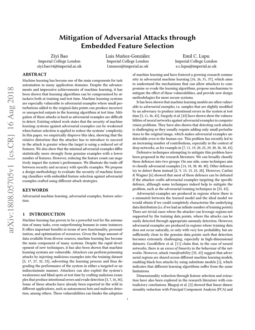 Mitigation of Adversarial Attacks through Embedded Feature Selection