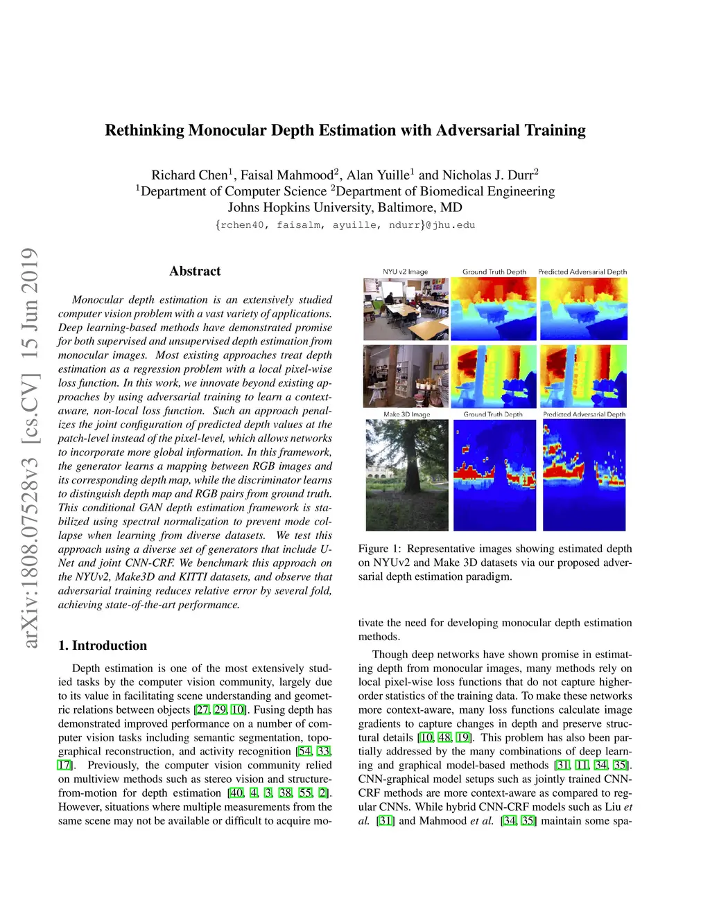 Monocular depth estimation is an extensively studied computer vision problem with a vast variety of applications. Deep learning-based methods have demonstrated promise for both supervised and unsupervised depth estimation from monocular images. Most existing approaches treat depth estimation as a regression problem with a local pixel-wise loss function. In this work, we innovate beyond existing approaches by using adversarial training to learn a context-aware, non-local loss function. Such an approach penalizes the joint configuration of predicted depth values at the patch-level instead of the pixel-level, which allows networks to incorporate more global information. In this framework, the generator learns a mapping between RGB images and its corresponding depth map, while the discriminator learns to distinguish depth map and RGB pairs from ground truth. This conditional GAN depth estimation framework is stabilized using spectral normalization to prevent mode collapse when learning from diverse datasets. We test this approach using a diverse set of generators that include U-Net and joint CNN-CRF. We benchmark this approach on the NYUv2, Make3D and KITTI datasets, and observe that adversarial training reduces relative error by several fold, achieving state-of-the-art performance.