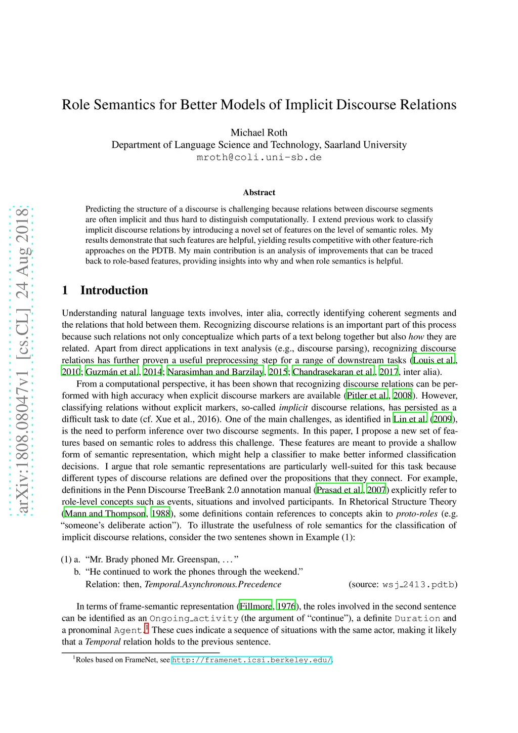 Predicting the structure of a discourse is challenging because relations between discourse segments are often implicit and thus hard to distinguish computationally. I extend previous work to classify implicit discourse relations by introducing a novel set of features on the level of semantic roles. My results demonstrate that such features are helpful, yielding results competitive with other feature-rich approaches on the PDTB. My main contribution is an analysis of improvements that can be traced back to role-based features, providing insights into why and when role semantics is helpful.