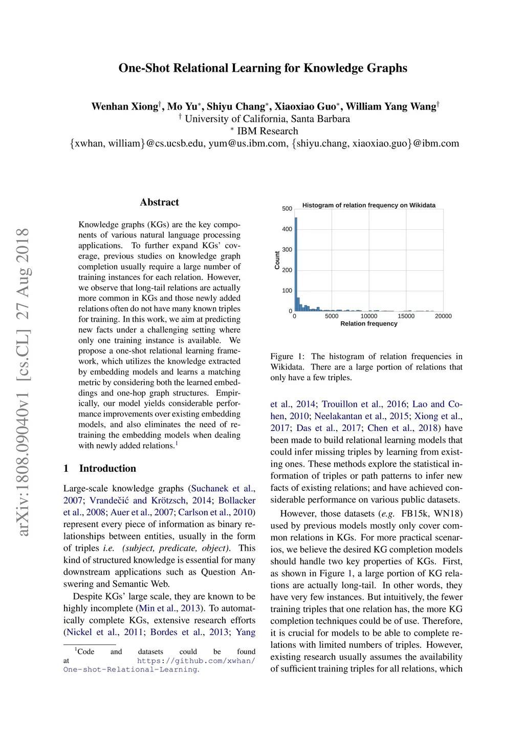 Knowledge graphs (KGs) are the key components of various natural language processing applications. To further expand KGs' coverage, previous studies on knowledge graph completion usually require a large number of training instances for each relation. However, we observe that long-tail relations are actually more common in KGs and those newly added relations often do not have many known triples for training. In this work, we aim at predicting new facts under a challenging setting where only one training instance is available. We propose a one-shot relational learning framework, which utilizes the knowledge extracted by embedding models and learns a matching metric by considering both the learned embeddings and one-hop graph structures. Empirically, our model yields considerable performance improvements over existing embedding models, and also eliminates the need of re-training the embedding models when dealing with newly added relations.