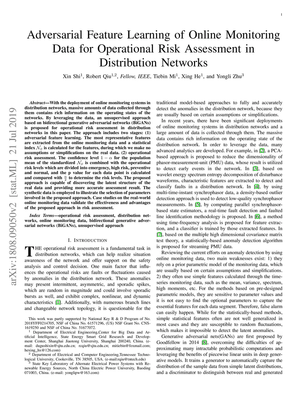 With the deployment of online monitoring systems in distribution networks, massive amounts of data collected through them contains rich information on the operating states of the networks. By leveraging the data, an unsupervised approach based on bidirectional generative adversarial networks (BiGANs) is proposed for operational risk assessment in distribution networks in this paper. The approach includes two stages: (1) adversarial feature learning. The most representative features are extracted from the online monitoring data and a statistical index is calculated for the features, during which we make no assumptions or simplifications on the real data. (2) operational risk assessment. The confidence level for the population mean of the standardized is combined with the operational risk levels which are divided into emergency, high risk, preventive and normal, and the p value for each data point is calculated and compared with to determine the risk levels. The proposed approach is capable of discovering the latent structure of the real data and providing more accurate assessment result. The synthetic data is employed to illustrate the selection of parameters involved in the proposed approach. Case studies on the real-world online monitoring data validate the effectiveness and advantages of the proposed approach in risk assessment.