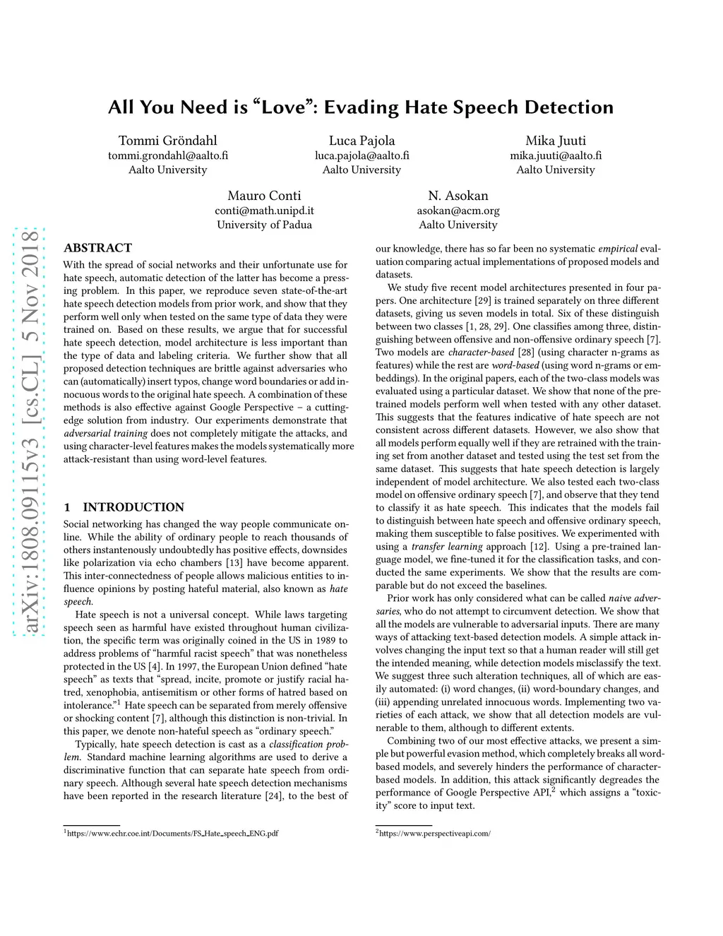 With the spread of social networks and their unfortunate use for hate speech, automatic detection of the latter has become a pressing problem. In this paper, we reproduce seven state-of-the-art hate speech detection models from prior work, and show that they perform well only when tested on the same type of data they were trained on. Based on these results, we argue that for successful hate speech detection, model architecture is less important than the type of data and labeling criteria. We further show that all proposed detection techniques are brittle against adversaries who can (automatically) insert typos, change word boundaries or add innocuous words to the original hate speech. A combination of these methods is also effective against Google Perspective -- a cutting-edge solution from industry. Our experiments demonstrate that adversarial training does not completely mitigate the attacks, and using character-level features makes the models systematically more attack-resistant than using word-level features.