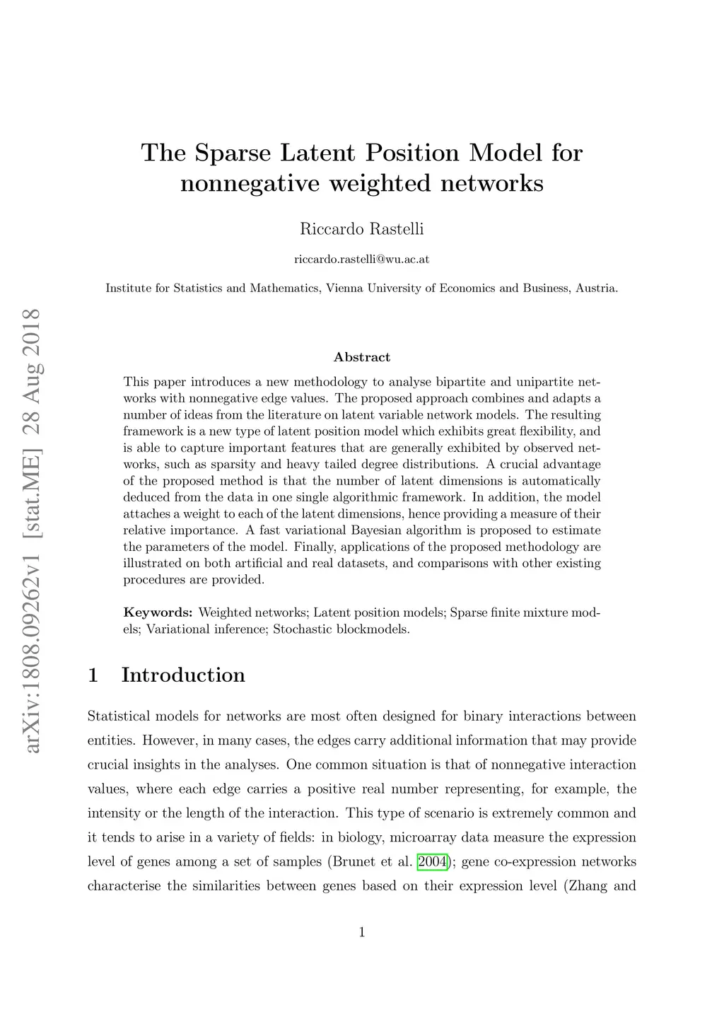 This paper introduces a new methodology to analyse bipartite and unipartite networks with nonnegative edge values. The proposed approach combines and adapts a number of ideas from the literature on latent variable network models. The resulting framework is a new type of latent position model which exhibits great flexibility, and is able to capture important features that are generally exhibited by observed networks, such as sparsity and heavy tailed degree distributions. A crucial advantage of the proposed method is that the number of latent dimensions is automatically deduced from the data in one single algorithmic framework. In addition, the model attaches a weight to each of the latent dimensions, hence providing a measure of their relative importance. A fast variational Bayesian algorithm is proposed to estimate the parameters of the model. Finally, applications of the proposed methodology are illustrated on both artificial and real datasets, and comparisons with other existing procedures are provided.