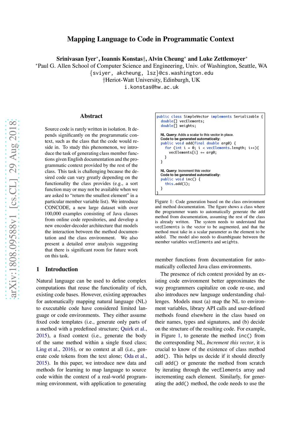 Source code is rarely written in isolation. It depends significantly on the programmatic context, such as the class that the code would reside in. To study this phenomenon, we introduce the task of generating class member functions given English documentation and the programmatic context provided by the rest of the class. This task is challenging because the desired code can vary greatly depending on the functionality the class provides (e.g., a sort function may or may not be available when we are asked to "return the smallest element" in a particular member variable list). We introduce CONCODE, a new large dataset with over 100,000 examples consisting of Java classes from online code repositories, and develop a new encoder-decoder architecture that models the interaction between the method documentation and the class environment. We also present a detailed error analysis suggesting that there is significant room for future work on this task.