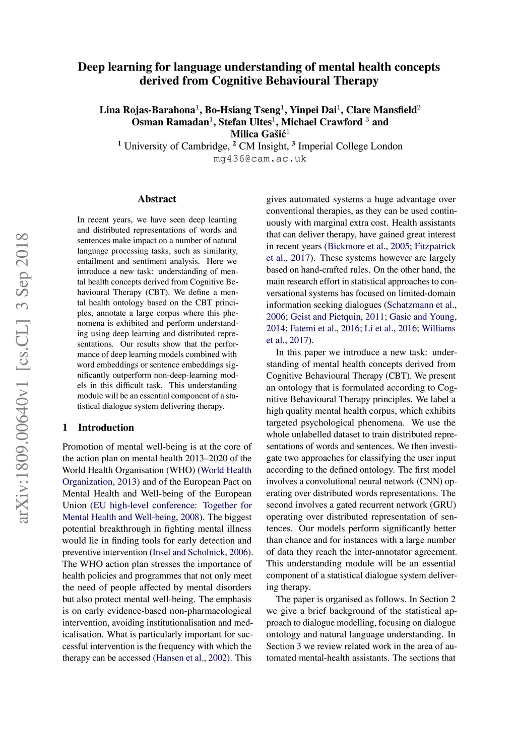 In recent years, we have seen deep learning and distributed representations of words and sentences make impact on a number of natural language processing tasks, such as similarity, entailment and sentiment analysis. Here we introduce a new task: understanding of mental health concepts derived from Cognitive Behavioural Therapy (CBT). We define a mental health ontology based on the CBT principles, annotate a large corpus where this phenomena is exhibited and perform understanding using deep learning and distributed representations. Our results show that the performance of deep learning models combined with word embeddings or sentence embeddings significantly outperform non-deep-learning models in this difficult task. This understanding module will be an essential component of a statistical dialogue system delivering therapy.