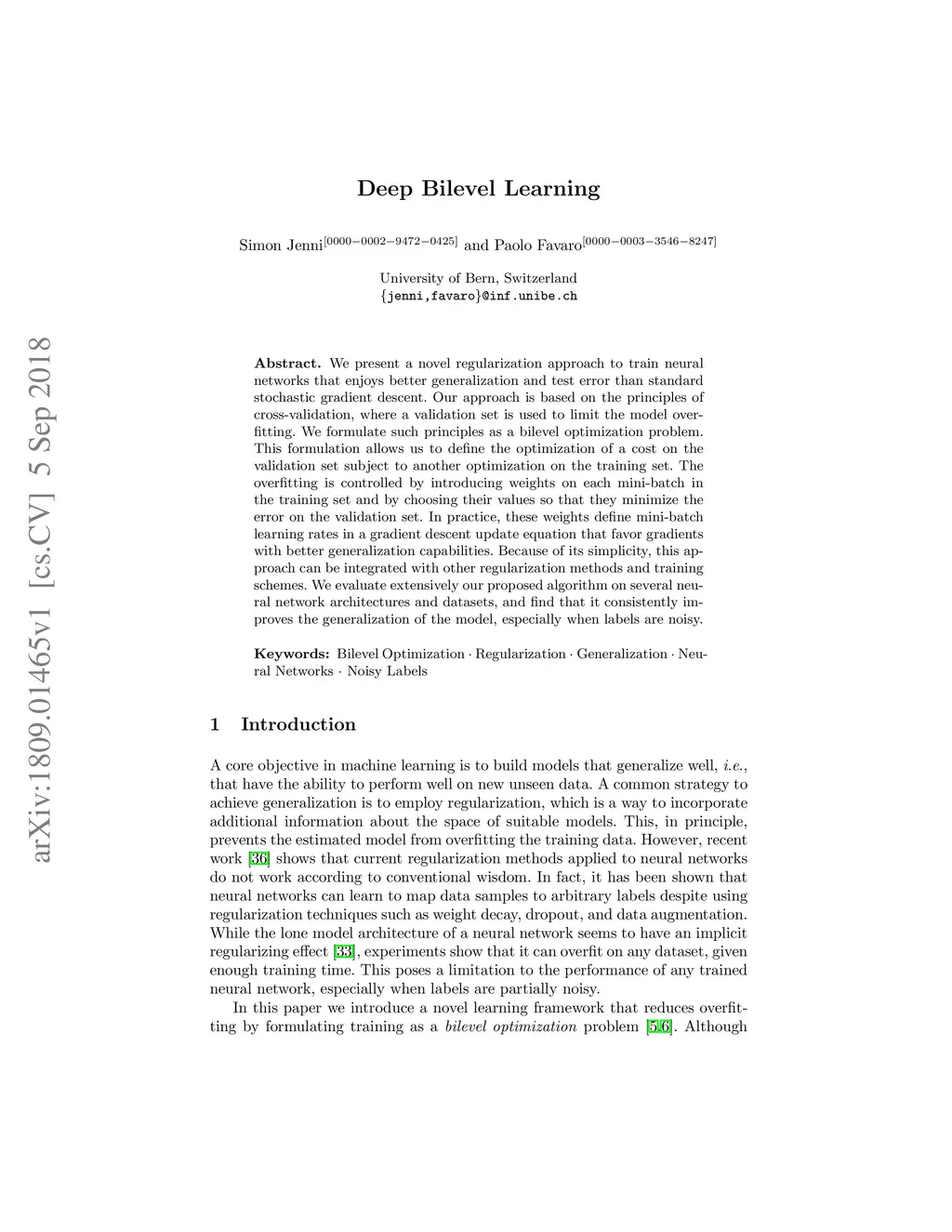 We present a novel regularization approach to train neural networks that enjoys better generalization and test error than standard stochastic gradient descent. Our approach is based on the principles of cross-validation, where a validation set is used to limit the model overfitting. We formulate such principles as a bilevel optimization problem. This formulation allows us to define the optimization of a cost on the validation set subject to another optimization on the training set. The overfitting is controlled by introducing weights on each mini-batch in the training set and by choosing their values so that they minimize the error on the validation set. In practice, these weights define mini-batch learning rates in a gradient descent update equation that favor gradients with better generalization capabilities. Because of its simplicity, this approach can be integrated with other regularization methods and training schemes. We evaluate extensively our proposed algorithm on several neural network architectures and datasets, and find that it consistently improves the generalization of the model, especially when labels are noisy.